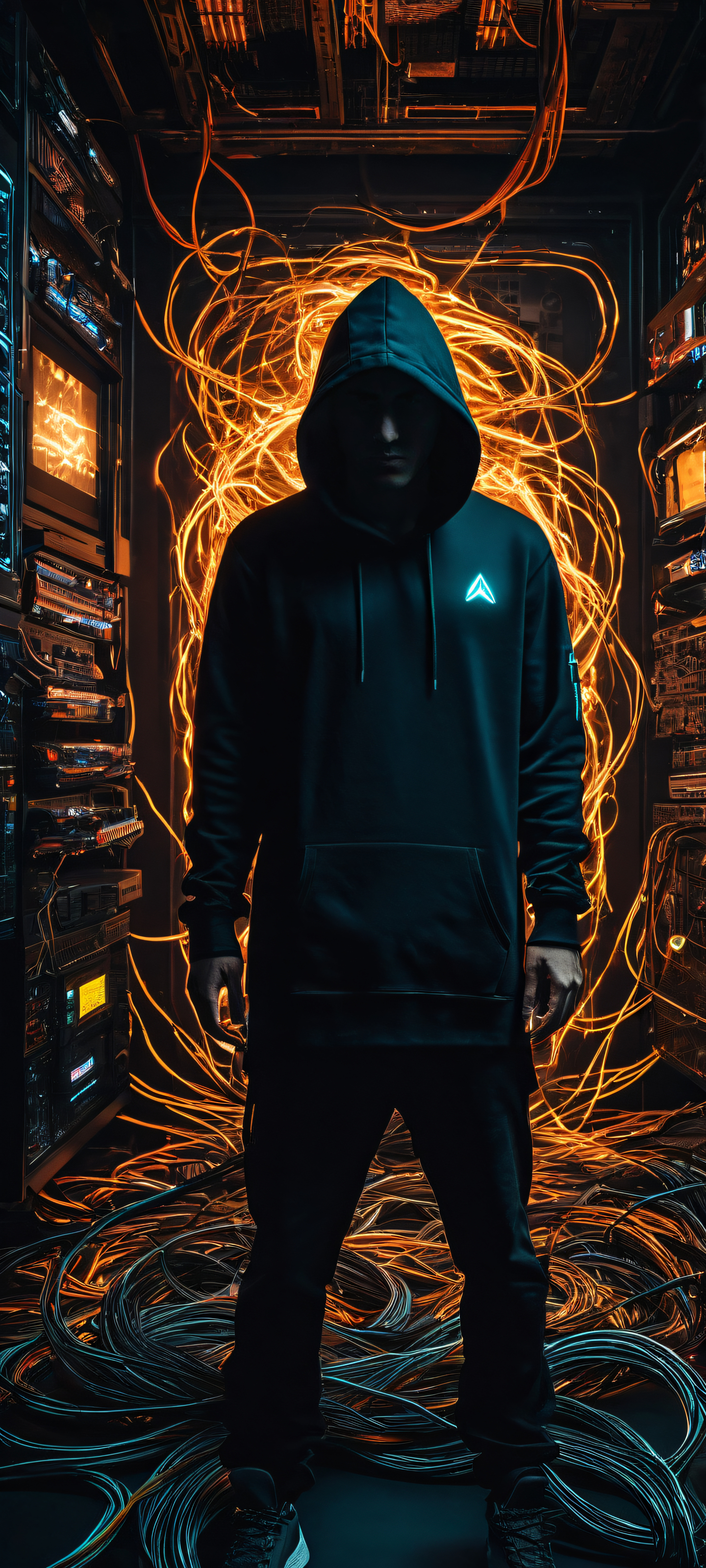 A breathtaking vertical portrait artwork of A hapless gamer, clad in a black Civitai hoodie, placed in the lower-middle with insane micro-details of tangled wires and scattered RAM sticks, with fries and GPUs spilled all over the floor., The background features a perfectly clean and empty top half with vast pure void, providing ample UI breathing space, while the lower-half showcases the mayhem of scattered tech components., Award-winning digital art, stunning visual impact, and pristine clarity evoke a sense of playful chaos., Deep perfect blacks and striking crisp contrast dominate the scene, with subtle luminescent accents adding a touch of humor to the dark mode aesthetic., A palette of deep blues and silvers, reminiscent of electronic components, sets the tone for this humorous take on gamer culture., elegant low-key lighting, deep perfect blacks, striking contrast, sleek dark mode aesthetic, luminescent accents, deep rich colors, portrait composition, centered subject in the lower middle, perfectly clean and smooth top half for UI, extreme depth of field blurred background, highly textured surfaces, intricate micro-details, physically based rendering, award-winning digital art, epic breathtaking scale, stunning visual impact, perfect composition, macOS wallpaper aesthetic, masterpiece, 2K QHD resolution, 9:20 aspect ratio.
