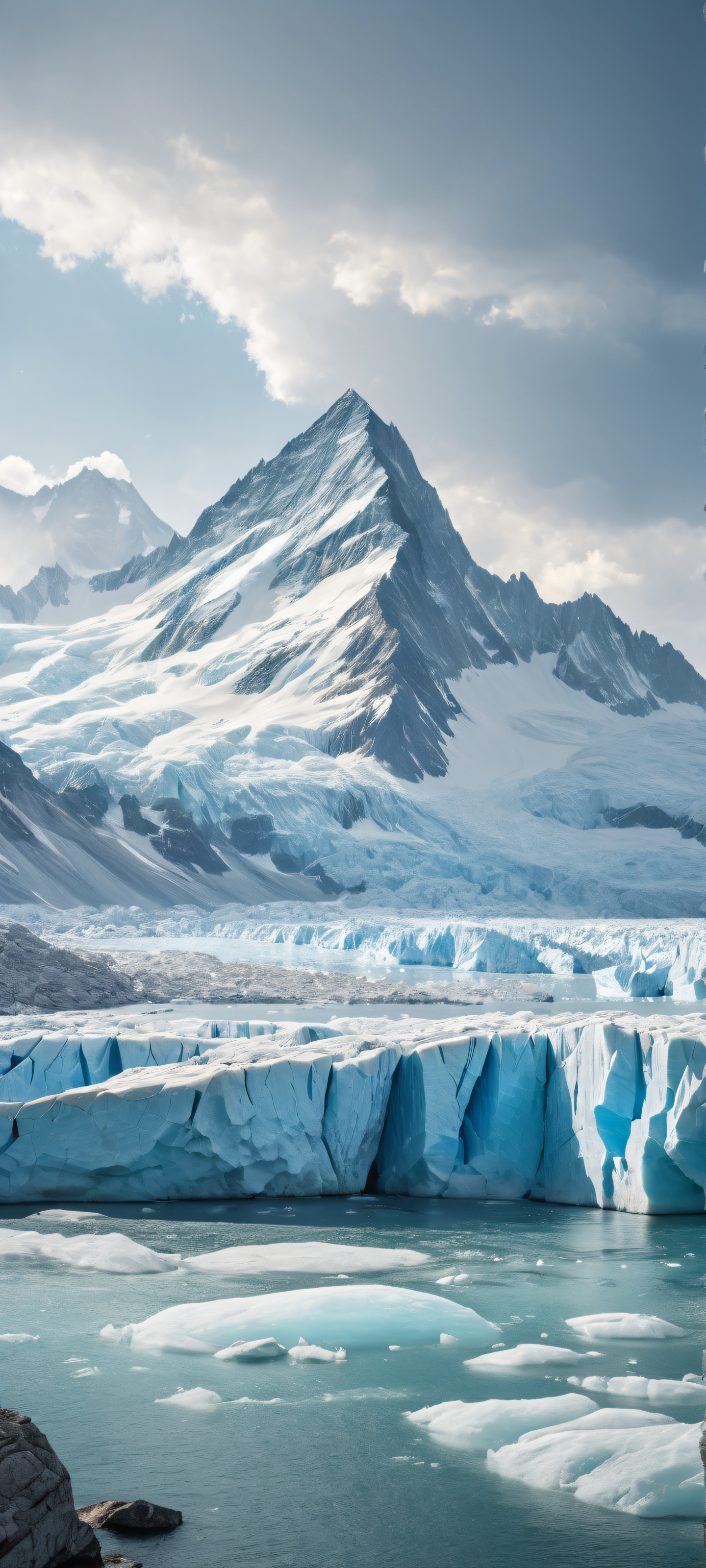 A breathtaking vertical portrait artwork of A photograph of glaciers placed in the lower-middle with intricate micro-details of stone in the foreground., Perfectly clean and empty top half with vast pure void, contrasted by the vast prairie below, perfectly capturing the essence of a serene rainstorm., Award-winning digital art with pristine clarity, boasting stunning visual impact and Apple UI level quality., Ethereal lighting with radiant colors, ray-traced reflections, and pristine clarity, casting an otherworldly glow on the scene., A palette dominated by soothing blues and whites, evoking a sense of serenity and calmness, with hints of warm beige and misty gray, ethereal lighting, radiant, brilliant colors, ray traced reflections, pristine clarity, portrait composition, centered subject in the lower middle, perfectly clean and smooth top half for UI, extreme depth of field blurred background, highly textured surfaces, intricate micro-details, physically based rendering, award-winning digital art, epic breathtaking scale, stunning visual impact, perfect composition, macOS wallpaper aesthetic, masterpiece, 2K QHD resolution, 9:20 aspect ratio.