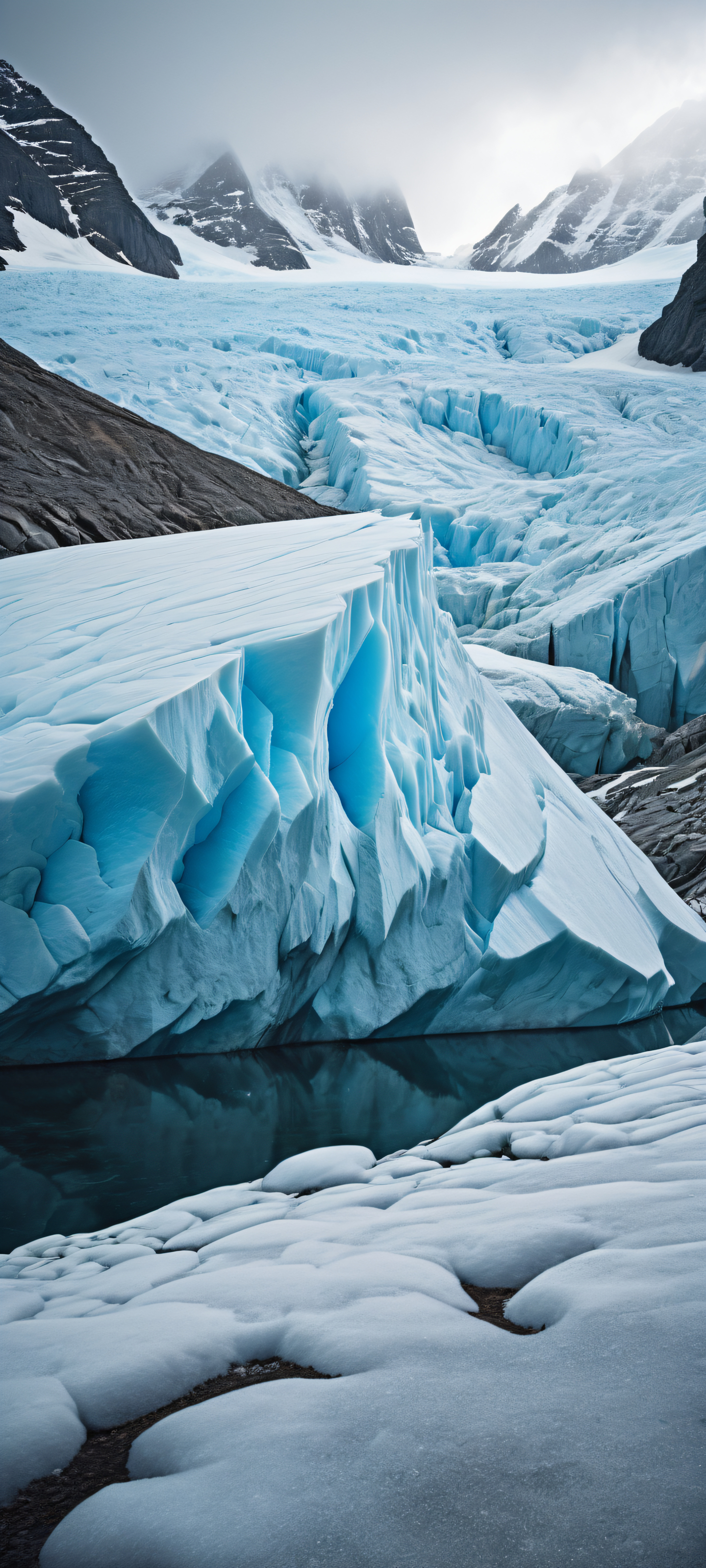 Parfaitement optimisé pour votre iPhone, SamsungGalaxy, et écrans d'accueil Android, this stunning digital art piece presents a breathtaking vertical portrait of a serene glacial landscape. With a centered stone in the lower middle, the top half is a pristine canvas of calm blues and whites, evoking the peace of nature on a rainy day.