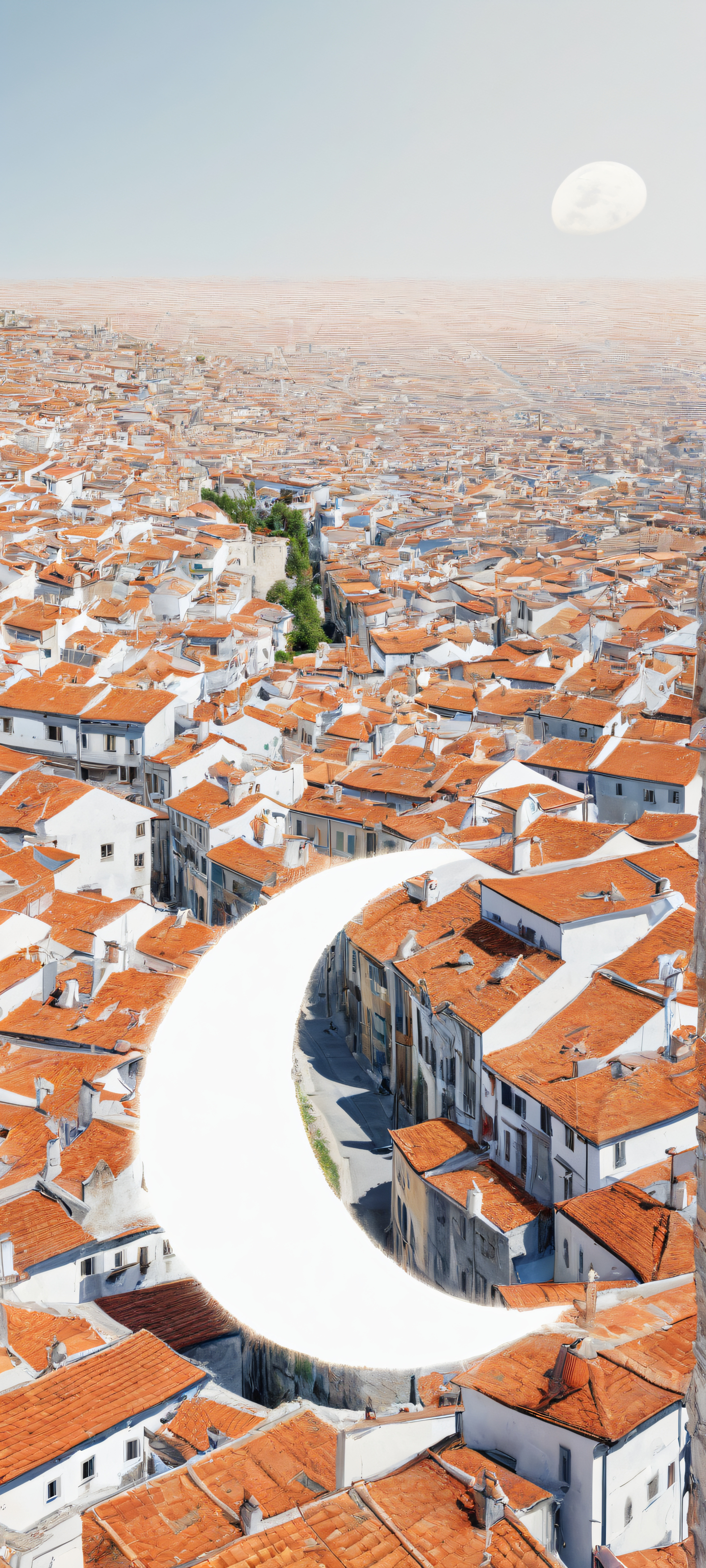 Elevate your mobile experience with this stunning vertical wallpaper, parfaitement optimisé pour iPhone, SamsungGalaxy, et écrans d'accueil Android. The abstracted moon shines brightly against the clean and empty top half, drawing your eye upwards to the textured rooftop scene. With extreme depth of field and high-key lighting, this masterpiece is sure to delight.