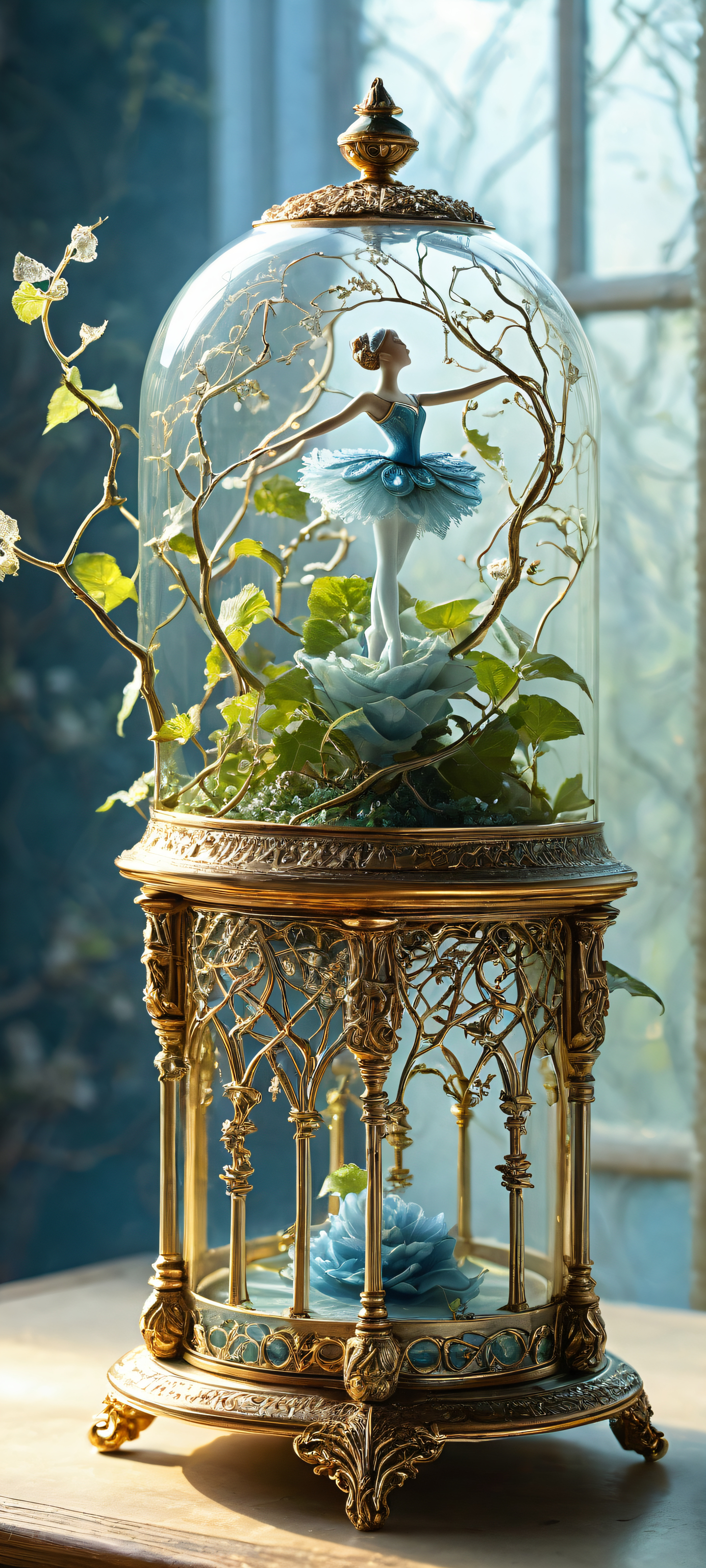 A breathtaking vertical portrait artwork of A delicate, gemstone-encrusted antique music box placed in the lower-middle with insane micro-details, its ballerina frozen in mid-pirouette, surrounded by a tangle of vines and tendrils that seem to be pulling it back into the earth., Perfectly clean and empty top half with vast pure void, a forgotten, mist-shrouded conservatory with decaying vines and tendrils in the lower-half., Award-winning digital art, stunning visual impact, pristine clarity, Éthéré, radiant, brilliant moonlight casting a flawless glow on the dusty music box and vines, [‘Soft blues’, ‘Pearly whites’, ‘Golden hues’], ethereal lighting, radiant, brilliant colors, ray traced reflections, pristine clarity, portrait composition, centered subject in the lower middle, perfectly clean and smooth top half for UI, extreme depth of field blurred background, highly textured surfaces, intricate micro-details, physically based rendering, award-winning digital art, epic breathtaking scale, stunning visual impact, perfect composition, macOS wallpaper aesthetic, masterpiece, 2K QHD resolution, 9:20 aspect ratio.