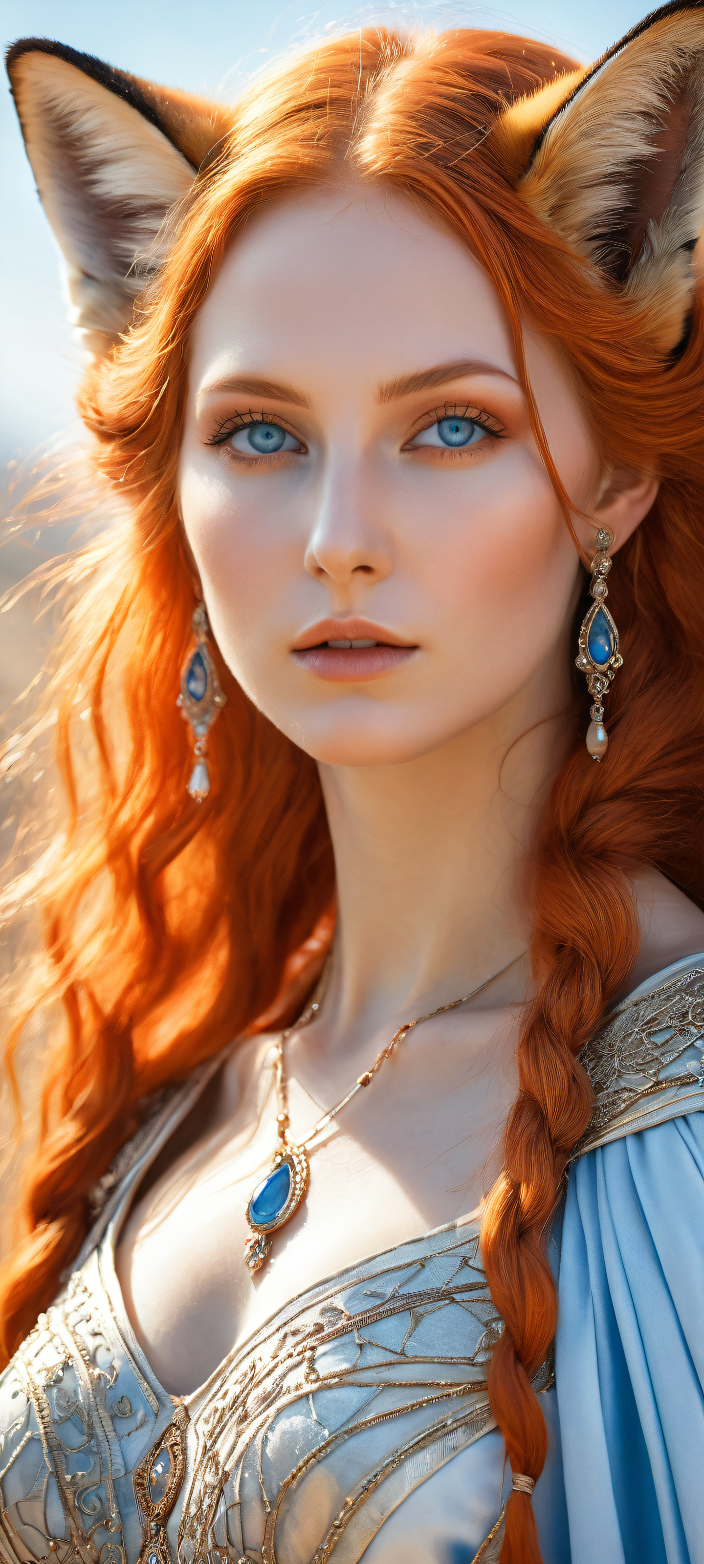 A breathtaking vertical portrait artwork of A mystical maiden with glistening orange locks and piercing blue eyes placed in the lower-middle, intricate micro-details of her fox ears and tail., Perfectly clean and empty top half with vast pure void, giving way to a serene landscape, gradually filling the screen with subtle texture and depth., Award-winning digital art, pristine clarity, blending fantasy and mysticism., Éthéré, radiant light illuminates the subject from above, casting no shadows, only gentle reflections on her hair and tail., Orange-copper hues dominate the palette, complemented by soft blues and creamy whites, evoking a sense of mystique and wonder., ethereal lighting, radiant, brilliant colors, ray traced reflections, pristine clarity, portrait composition, centered subject in the lower middle, perfectly clean and smooth top half for UI, extreme depth of field blurred background, highly textured surfaces, intricate micro-details, physically based rendering, award-winning digital art, epic breathtaking scale, stunning visual impact, perfect composition, macOS wallpaper aesthetic, masterpiece, 2K QHD resolution, 9:20 aspect ratio.
