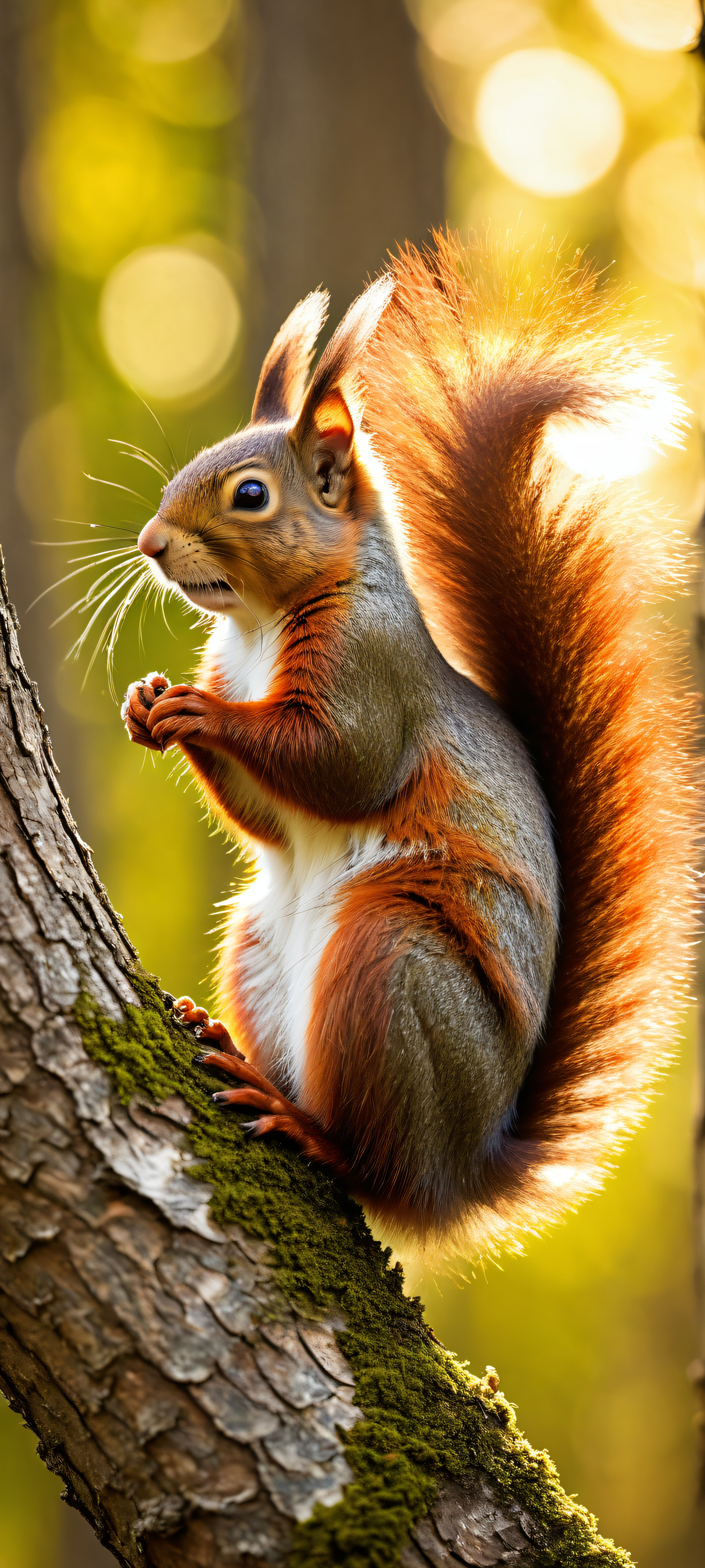 A breathtaking vertical portrait artwork of A majestic red squirrel placed in the lower-middle with insane micro-details, showcasing its tail and whiskers in stunning closeup., A perfectly clean and empty top half with vast pure void, gradually giving way to a blurry background of leaves and branch, creating an immersive nature scene., Award-winning digital art, pristine clarity, and a masterclass in composition, reminiscent of epic desktop wallpapers., Ethereal sunlight casting radiant beams across the squirrel’s fur, with subtle ray-traced reflections adding depth and dimensionality., Warm earthy tones, punctuated by flashes of fiery red, evoking a sense of excitement and energy., ethereal lighting, radiant, brilliant colors, ray traced reflections, pristine clarity, portrait composition, centered subject in the lower middle, perfectly clean and smooth top half for UI, extreme depth of field blurred background, highly textured surfaces, intricate micro-details, physically based rendering, award-winning digital art, epic breathtaking scale, stunning visual impact, perfect composition, macOS wallpaper aesthetic, masterpiece, 2K QHD resolution, 9:20 aspect ratio.