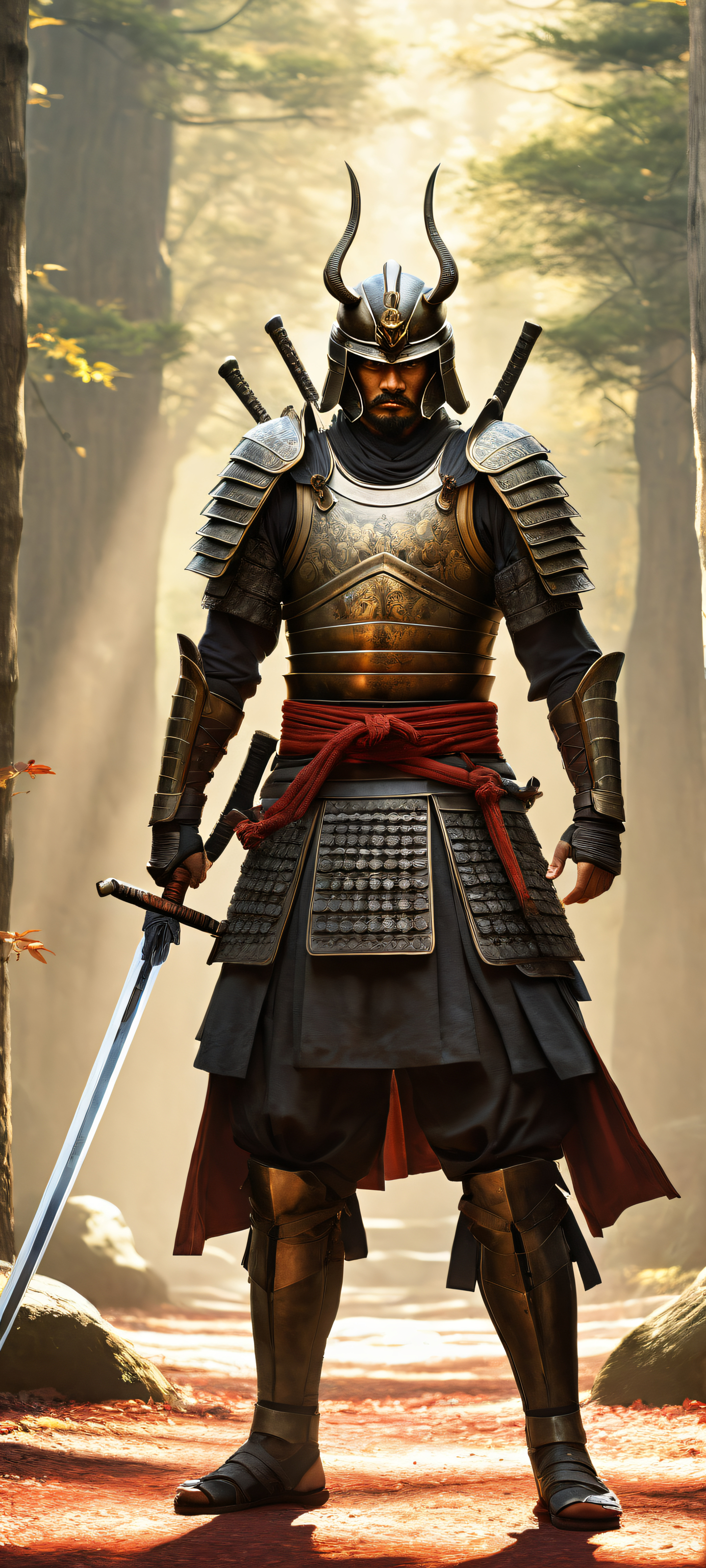 Transport yourself to a serene samurai landscape with this breathtaking digital art. Masterfully optimized for your iPhone, SamsungGalaxy, or Android home screen, this stunning portrait features the elegance of a samurai warrior’s armor and surroundings. The top half is perfectly clean and empty, allowing for seamless integration with UI widgets.