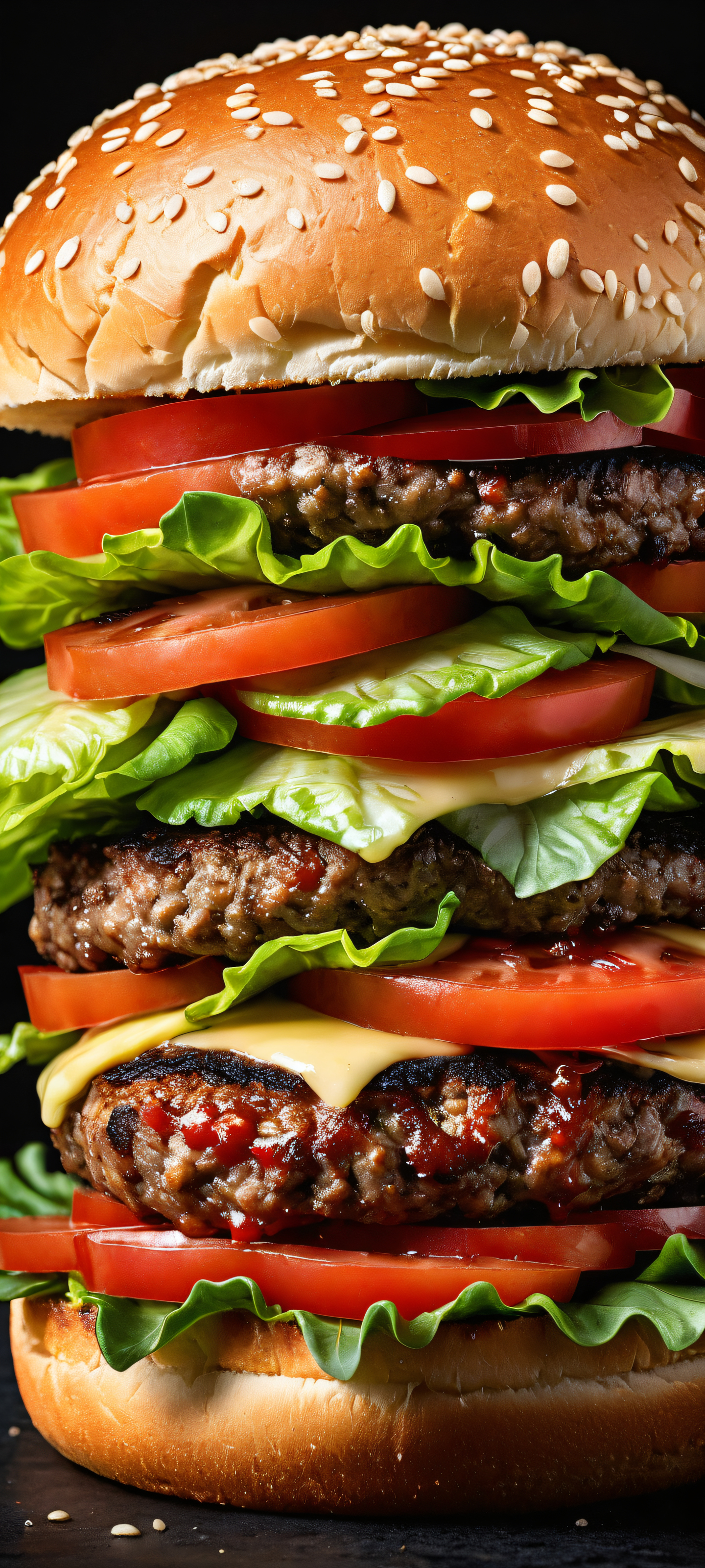 A breathtaking vertical portrait artwork of A succulent burger woman, placed in the lower-middle with insane micro-details of her bun, lettuce, tomato, and condiments., Perfectly clean and empty top half with vast pure void, allowing for seamless integration with iOS widgets. The bottom half features a serene culinary backdrop, complete with subtle texture and depth., Award-winning digital art, pristine clarity, and stunning visual impact, reminiscent of Apple UI level quality., Sleek dark mode aesthetic with deep perfect blacks, striking crisp contrast, and elegant luminescent accents. No cinematic lighting in sight, maintaining the sleekness and sophistication., Deep crimson reds, rich brown tones, and creamy whites, evoking the sensual appeal of a perfectly cooked burger, while maintaining the overall sleek dark mode aesthetic., elegant low-key lighting, deep perfect blacks, striking contrast, sleek dark mode aesthetic, luminescent accents, deep rich colors, portrait composition, centered subject in the lower middle, perfectly clean and smooth top half for UI, extreme depth of field blurred background, highly textured surfaces, intricate micro-details, physically based rendering, award-winning digital art, epic breathtaking scale, stunning visual impact, perfect composition, macOS wallpaper aesthetic, masterpiece, 2K QHD resolution, 9:20 aspect ratio.