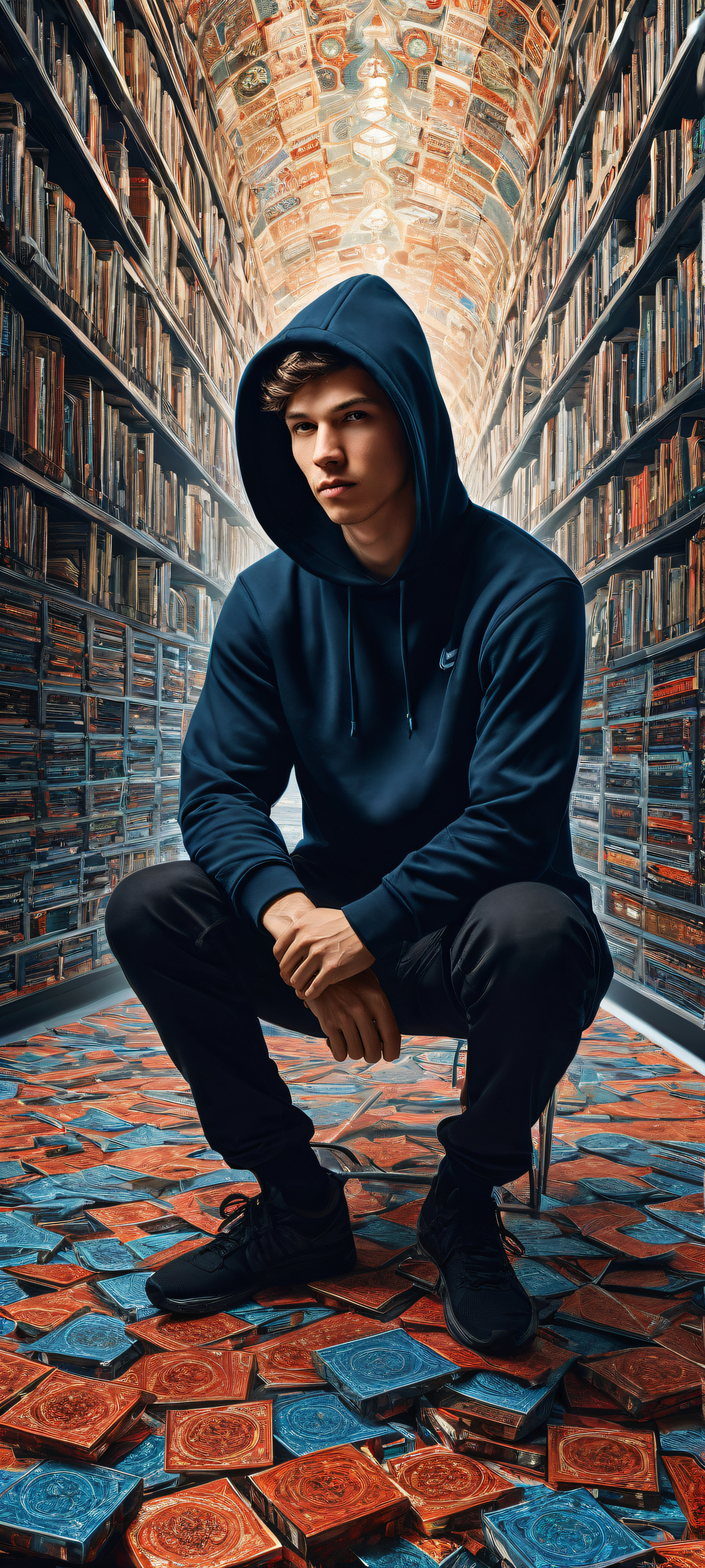 A breathtaking vertical portrait artwork of A tech enthusiast, wearing a black Civitai hoodie, is placed in the lower-middle of the wallpaper, with intricate micro-details on his outfit and facial expressions as he’s caught mid-trip, spilling a tray full of RAM sticks and GPUs all over the floor., The top half of the wallpaper is perfectly clean and empty, with a vast pure void above the chaotic scene, allowing for unobstructed UI breathing space., Award-winning digital art, stunning visual impact, featuring crisp lines, textures, and reflections, showcasing Apple UI level quality and pristine clarity., Ethereal lighting illuminates the scene, with soft, radiant colors and subtle ray-traced reflections on the metallic components, creating a bright and airy atmosphere., The dominant color palette features calming shades of blue (#87CEEB) and white (#FFFFFF), evoking a sense of comedic relief and playfulness., ethereal lighting, radiant, brilliant colors, ray traced reflections, pristine clarity, portrait composition, centered subject in the lower middle, perfectly clean and smooth top half for UI, extreme depth of field blurred background, highly textured surfaces, intricate micro-details, physically based rendering, award-winning digital art, epic breathtaking scale, stunning visual impact, perfect composition, macOS wallpaper aesthetic, masterpiece, 2K QHD resolution, 9:20 aspect ratio.