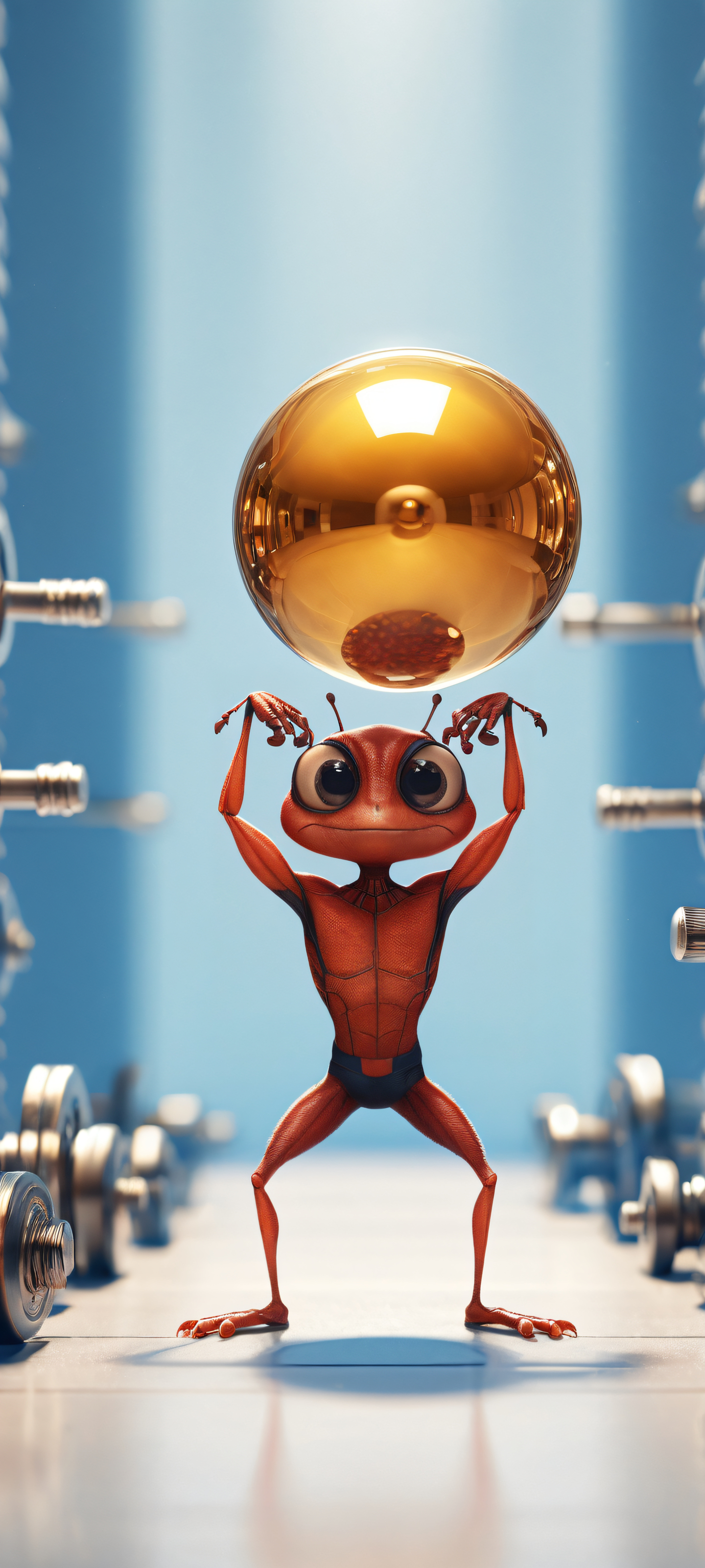 A breathtaking vertical portrait artwork of Ant Lifting a Tiny Dumbbell, placed in the lower-middle with insane micro-details of its miniature gym and surroundings., Perfectly clean and empty top half with vast pure void, giving way to a tiny, intricately detailed miniature gym in the lower-middle., Award-winning digital art, stunning visual impact with perfect blend of humor and cuteness, featuring pristine clarity., Ethereal lighting with radiant, brilliant colors and ray-traced reflections, creating an airy and bright ambiance., Primary color palette consists of warm tones such as golden brown, metallic silver, and deep blue, capturing the essence of humor and cuteness., ethereal lighting, radiant, brilliant colors, ray traced reflections, pristine clarity, portrait composition, centered subject in the lower middle, perfectly clean and smooth top half for UI, extreme depth of field blurred background, highly textured surfaces, intricate micro-details, physically based rendering, award-winning digital art, epic breathtaking scale, stunning visual impact, perfect composition, macOS wallpaper aesthetic, masterpiece, 2K QHD resolution, 9:20 aspect ratio.