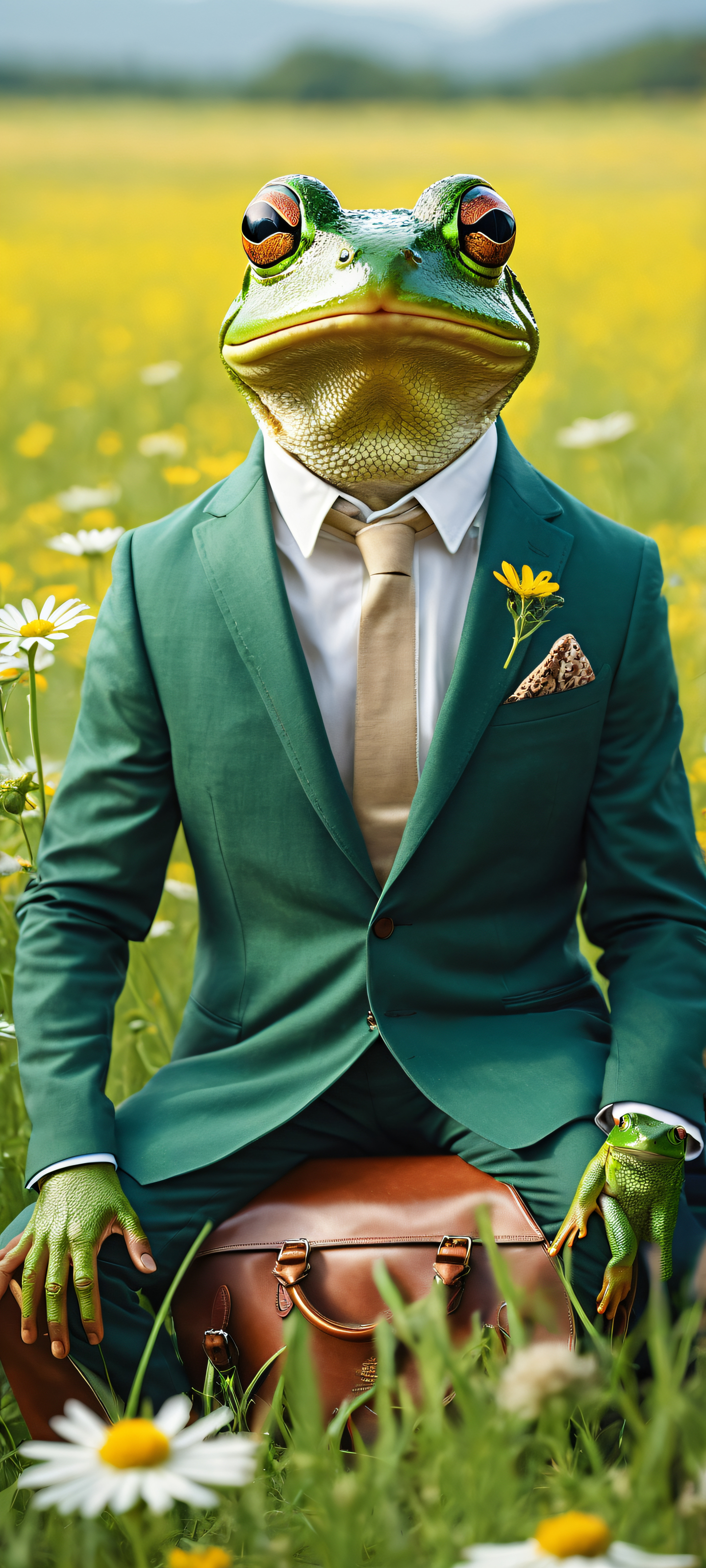 A breathtaking vertical portrait artwork of A whimsical frog in a tailored suit riding a huge mouse with a leather saddle, placed in the lower-middle with insane micro-details., Perfectly clean and empty top half with vast pure void, meadow background with soft wildflowers and green grass, Award-winning digital art, stunning visual impact, fine brush textures, delicate paper grain, and pristine clarity., Ethereal lighting with gentle daylight, radiant, brilliant colors, ray traced reflections, and pristine clarity. Bright and airy., [‘Pastel shades of green, yellow, and blue, with touches of warm beige and creamy white’], ethereal lighting, radiant, brilliant colors, ray traced reflections, pristine clarity, portrait composition, centered subject in the lower middle, perfectly clean and smooth top half for UI, extreme depth of field blurred background, highly textured surfaces, intricate micro-details, physically based rendering, award-winning digital art, epic breathtaking scale, stunning visual impact, perfect composition, macOS wallpaper aesthetic, masterpiece, 2K QHD resolution, 9:20 aspect ratio.