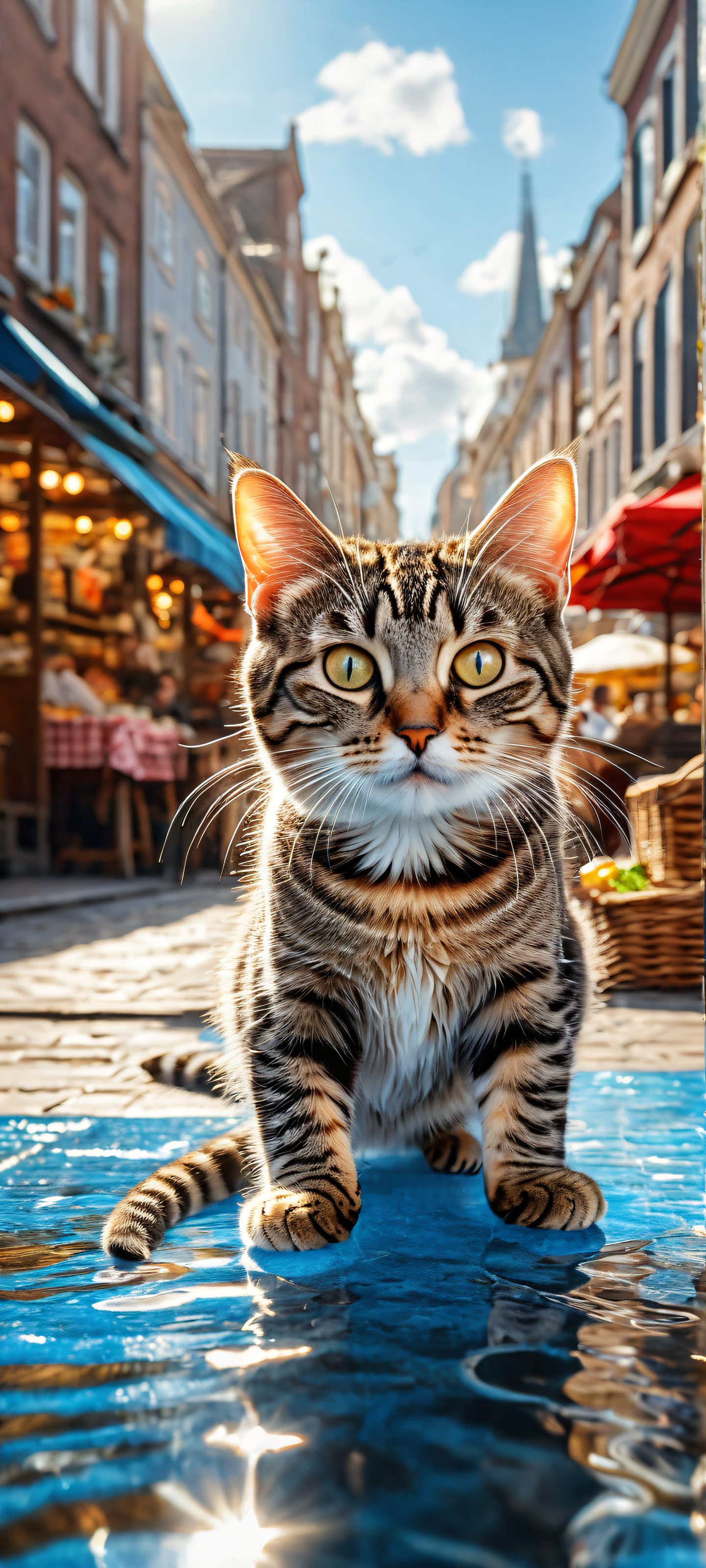 A breathtaking vertical portrait artwork of A small young tabby cat placed in the lower-middle, intricately micro-details, tightly hugging a large, shiny silver fish, with a determined and dramatic facial expression, as if mid-shout., Perfectly clean and empty top half with vast pure void, allowing for UI breathing space. Below, a bustling Dutch street market scene unfolds, featuring a fresh fish stall to the right., Award-winning digital art, stunning visual impact, pristine clarity, showcasing photorealistic details., Ethereal softbox lighting with subtle ray traced reflections, capturing the radiant colors of the silver fish and the vibrant atmosphere of the market., Dominant color palette: Warm beige (#F5F5F5), rich red-brown (#A52A2A), and radiant blue (#34A85A), evoking a sense of whimsical wonder., ethereal lighting, radiant, brilliant colors, ray traced reflections, pristine clarity, portrait composition, centered subject in the lower middle, perfectly clean and smooth top half for UI, extreme depth of field blurred background, highly textured surfaces, intricate micro-details, physically based rendering, award-winning digital art, epic breathtaking scale, stunning visual impact, perfect composition, macOS wallpaper aesthetic, masterpiece, 2K QHD resolution, 9:20 aspect ratio.