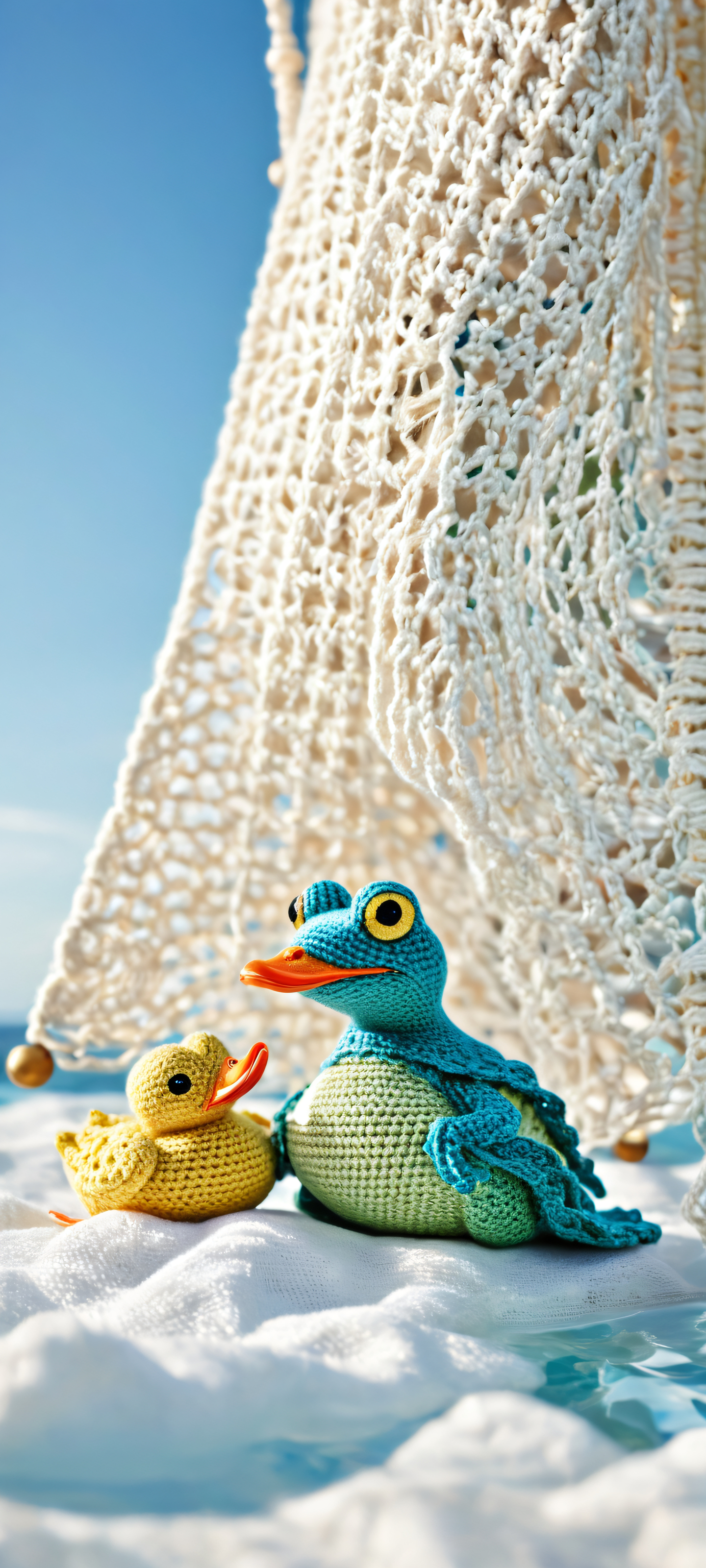 A beautifully crafted crocheted frog and duck duo on a majestic ship's stern, perfectly optimized for iPhone, Samsung Galaxy, and Android home screens.