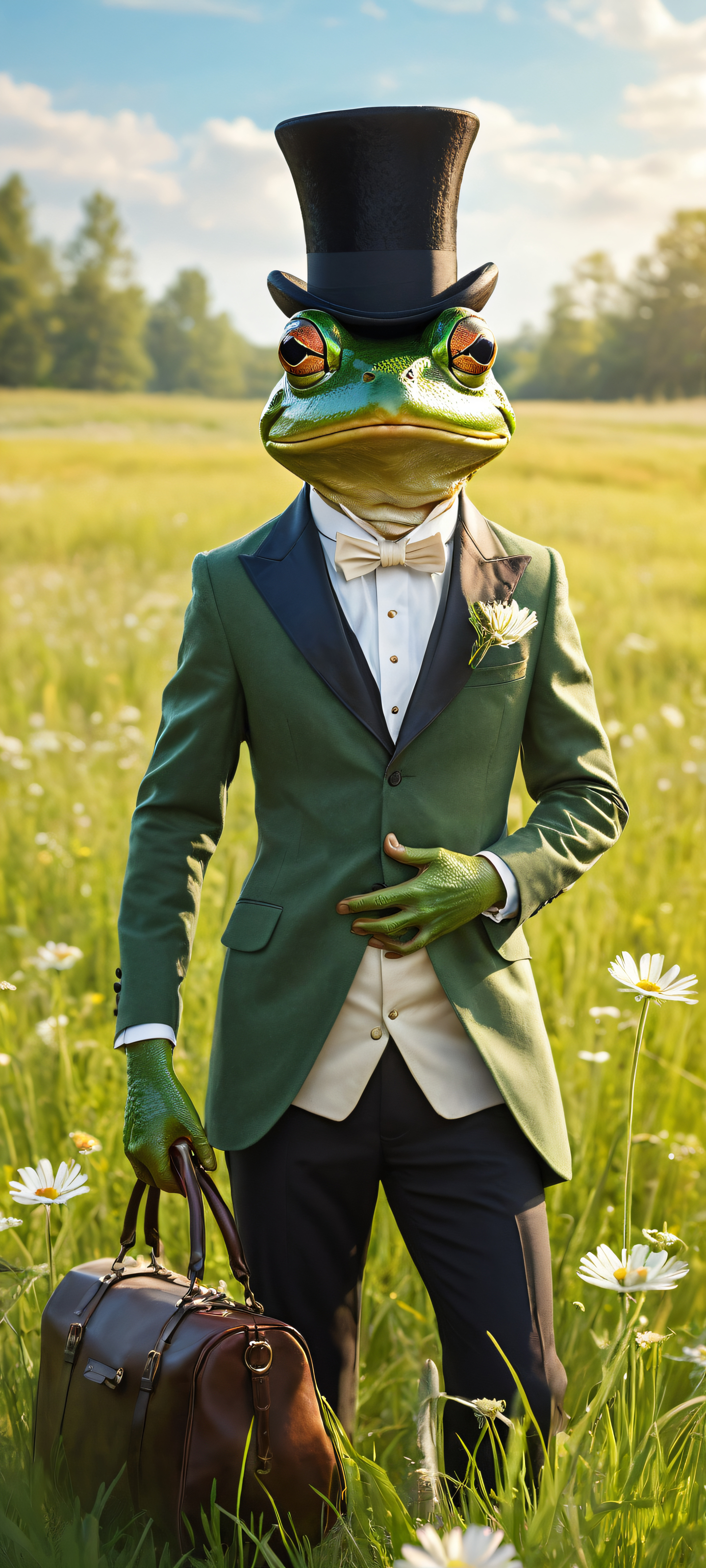 A breathtaking vertical portrait artwork of A stylized frog in a tailored suit, riding a majestic mouse with a leather saddle, holding a black top hat in one hand, placed in the lower-middle with intricate micro-details., A perfectly clean and empty top half with vast pure void, giving way to a meadow background featuring soft wildflowers and green grass, Award-winning digital art, pristine clarity, fine brush textures, and delicate paper grain, evoking a sense of storybook whimsy, Gentle daylight with radiant, brilliant colors, ray-traced reflections, and pristine clarity, casting a warm glow on the scene, Pastel hues of gentle greens, soft blues, and creamy whites, evoking a sense of playful storybook charm and whimsy, ethereal lighting, radiant, brilliant colors, ray traced reflections, pristine clarity, portrait composition, centered subject in the lower middle, perfectly clean and smooth top half for UI, extreme depth of field blurred background, highly textured surfaces, intricate micro-details, physically based rendering, award-winning digital art, epic breathtaking scale, stunning visual impact, perfect composition, macOS wallpaper aesthetic, masterpiece, 2K QHD resolution, 9:20 aspect ratio.