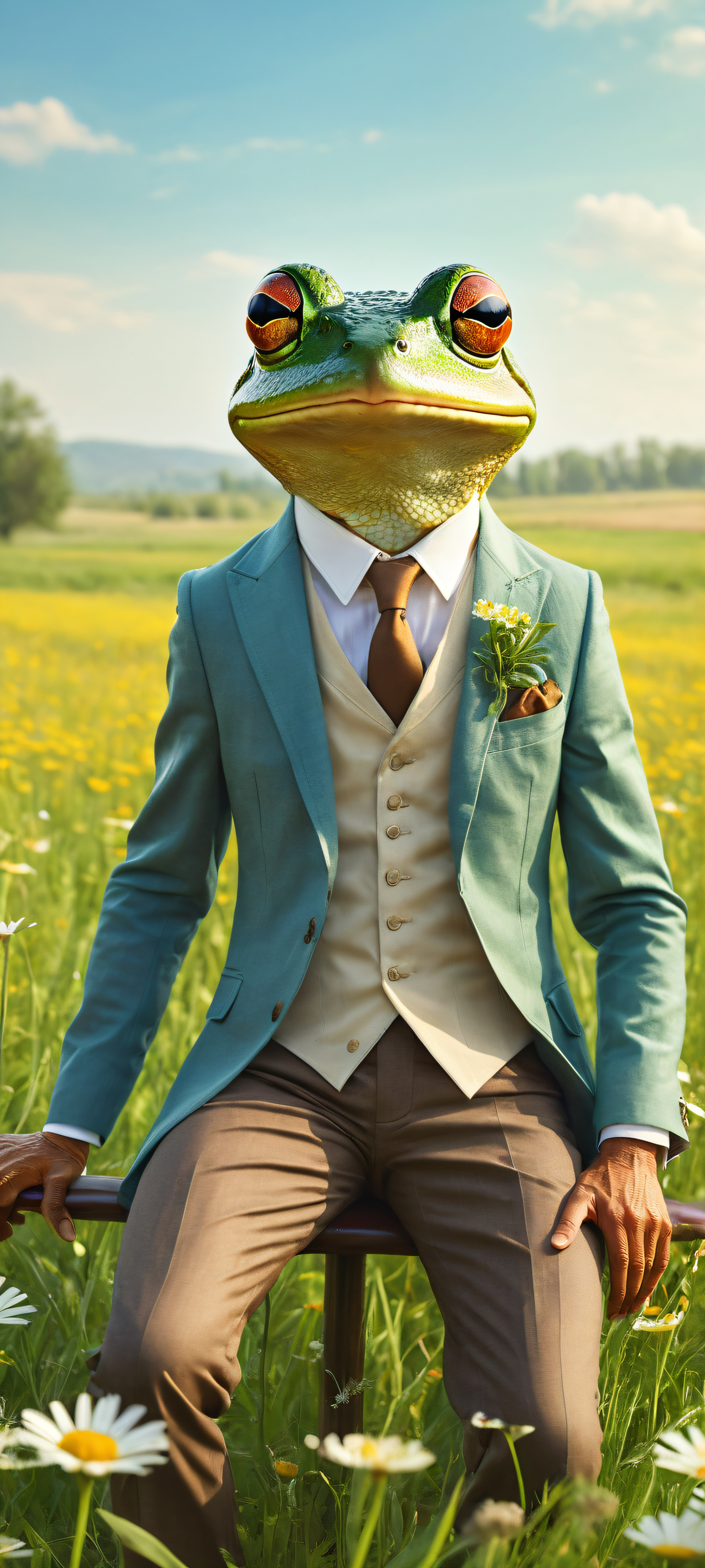 Step into the enchanting world of this award-winning digital art masterpiece, perfectly optimized for your iPhone, Samsung Galaxy, and Android home screens. The stunning visual impact features a whimsical frog in a tailored suit riding a huge mouse with leather saddle, placed in the lower-middle with insane micro-details. Against a serene meadow background with soft wildflowers and green grass, ethereal lighting, radiant colors, ray-traced reflections, and pristine clarity come together to create a breathtaking visual experience.