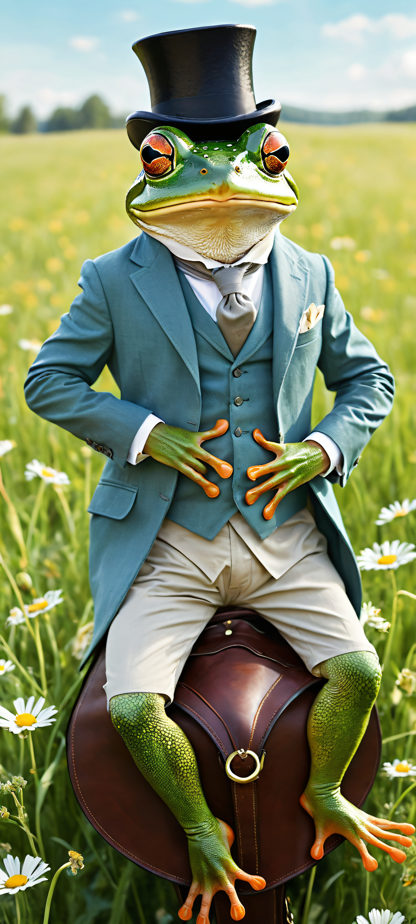 A breathtaking vertical portrait artwork of A whimsical frog in a tailored suit riding a huge mouse with a leather saddle, holding a black top hat in one hand, placed in the lower-middle with insane micro-details., A meadow background with soft wildflowers and green grass, perfectly clean and empty top half with vast pure void, Award-winning digital art, pristine clarity, fine brush textures, and delicate paper grain, reminiscent of classic watercolor illustrations, Ethereal daylight with gentle warmth and radiant highlights, ray traced reflections on the mouse’s leather saddle and the frog’s tailored suit, Soft pastel palette with dominant colors of light blue, pale yellow, and creamy white, evoking a sense of playful storybook whimsy, ethereal lighting, radiant, brilliant colors, ray traced reflections, pristine clarity, portrait composition, centered subject in the lower middle, perfectly clean and smooth top half for UI, extreme depth of field blurred background, highly textured surfaces, intricate micro-details, physically based rendering, award-winning digital art, epic breathtaking scale, stunning visual impact, perfect composition, macOS wallpaper aesthetic, masterpiece, 2K QHD resolution, 9:20 aspect ratio.