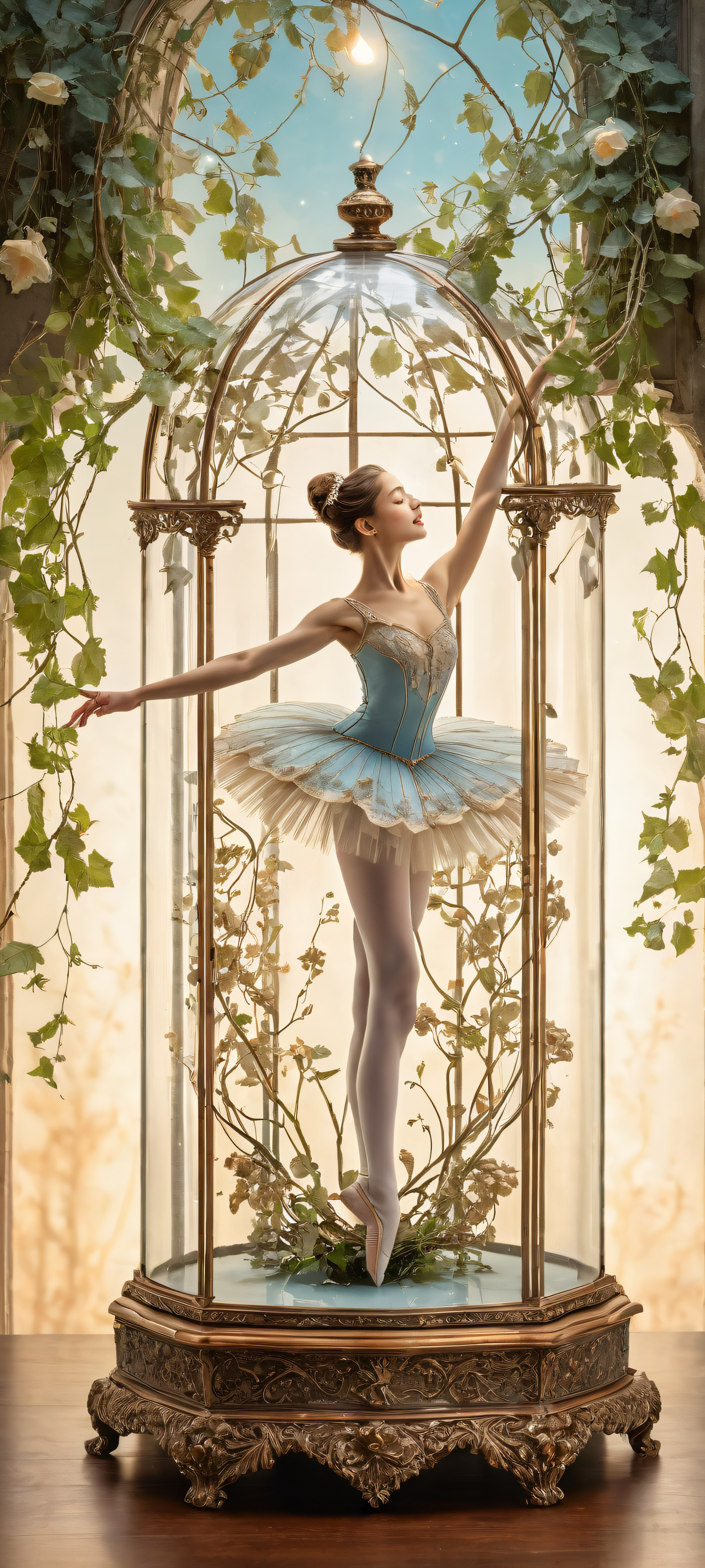 A breathtaking vertical portrait artwork of Antique music box placed in the lower-middle with intricate micro-details, vines and tendrils entwining it, frozen ballerina mid-pirouette., Perfectly clean and empty top half with vast pure void, allowing for a stunning vertical perspective. The bottom half is filled with lush vines, tendrils, and decay., Award-winning digital art, pristine clarity, showcasing refined textures and precise rendering., Ethereal moonlight casting an ethereal glow on the dusty, decaying surroundings, radiating soft, brilliant colors., Soft blues, pale yellows, misty whites, and warm browns dominate the palette, evoking a sense of nostalgia and forgotten beauty., ethereal lighting, radiant, brilliant colors, ray traced reflections, pristine clarity, portrait composition, centered subject in the lower middle, perfectly clean and smooth top half for UI, extreme depth of field blurred background, highly textured surfaces, intricate micro-details, physically based rendering, award-winning digital art, epic breathtaking scale, stunning visual impact, perfect composition, macOS wallpaper aesthetic, masterpiece, 2K QHD resolution, 9:20 aspect ratio.