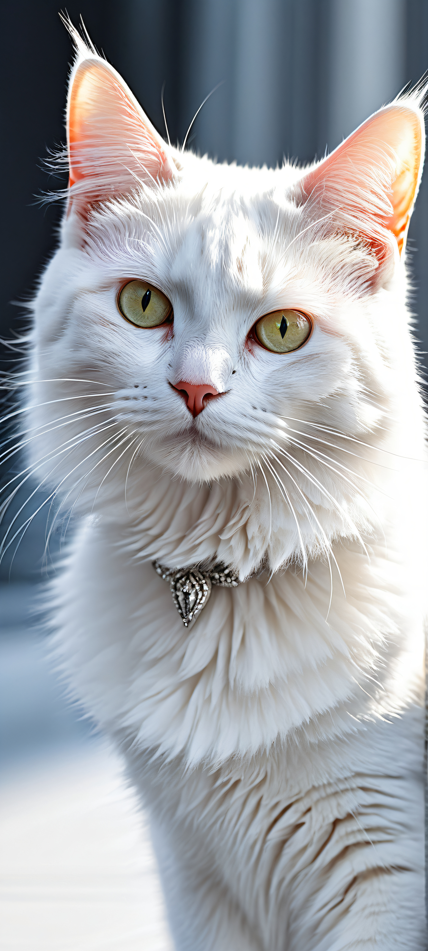 A breathtaking vertical portrait artwork of A futuristic tsukihime, placed in the lower-middle with insane micro-details of intricate fur texture and feral cat eyes, gazing up at a gleaming white bow., Perfectly clean and empty top half with vast pure void, gradually transitioning to high-resolution, detailed cat’s fur in mid-to-lower half, while bottom half remains largely dark with minimal atmospheric effects., Award-winning digital art, stunning visual impact, pristine clarity, blending seamlessly into the perfectly clean and empty top half with vast pure void, showcasing mastery of Apple UI level design., Ethereal, radiant, and brilliant colors, ray-traced reflections on the bow and cat’s eyes, and a subtle gradient of light from pure void at top to deep shadows towards bottom., Dominant color palette consists of white (#FFFFFF), black (#000000), and metallic silver (#B1B1B1), evoking a futuristic and high-tech ambiance., ethereal lighting, radiant, brilliant colors, ray traced reflections, pristine clarity, portrait composition, centered subject in the lower middle, perfectly clean and smooth top half for UI, extreme depth of field blurred background, highly textured surfaces, intricate micro-details, physically based rendering, award-winning digital art, epic breathtaking scale, stunning visual impact, perfect composition, macOS wallpaper aesthetic, masterpiece, 2K QHD resolution, 9:20 aspect ratio.