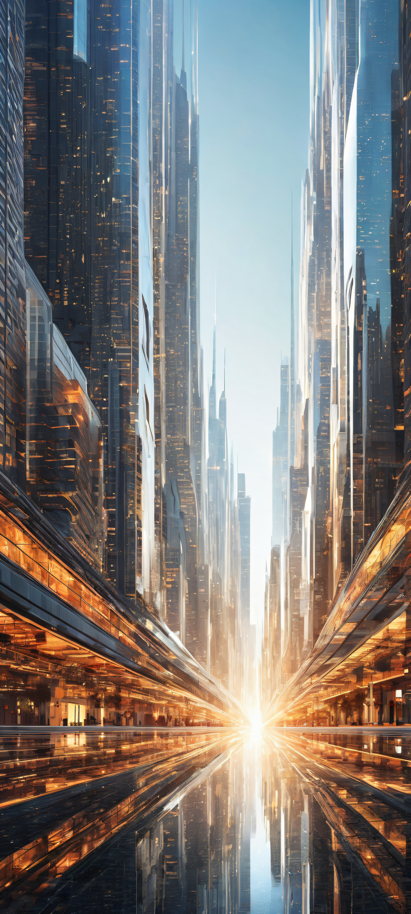 Ethereal lighting sets the tone for this stunning digital art masterpiece. Perfectly centered in the lower middle, the futuristic cityscape is set against a pristine black and white background, allowing for a smooth UI experience on your iPhone or Samsung Galaxy device. The extreme depth of field blurred background adds texture and dimensionality to the already breathtaking visuals.