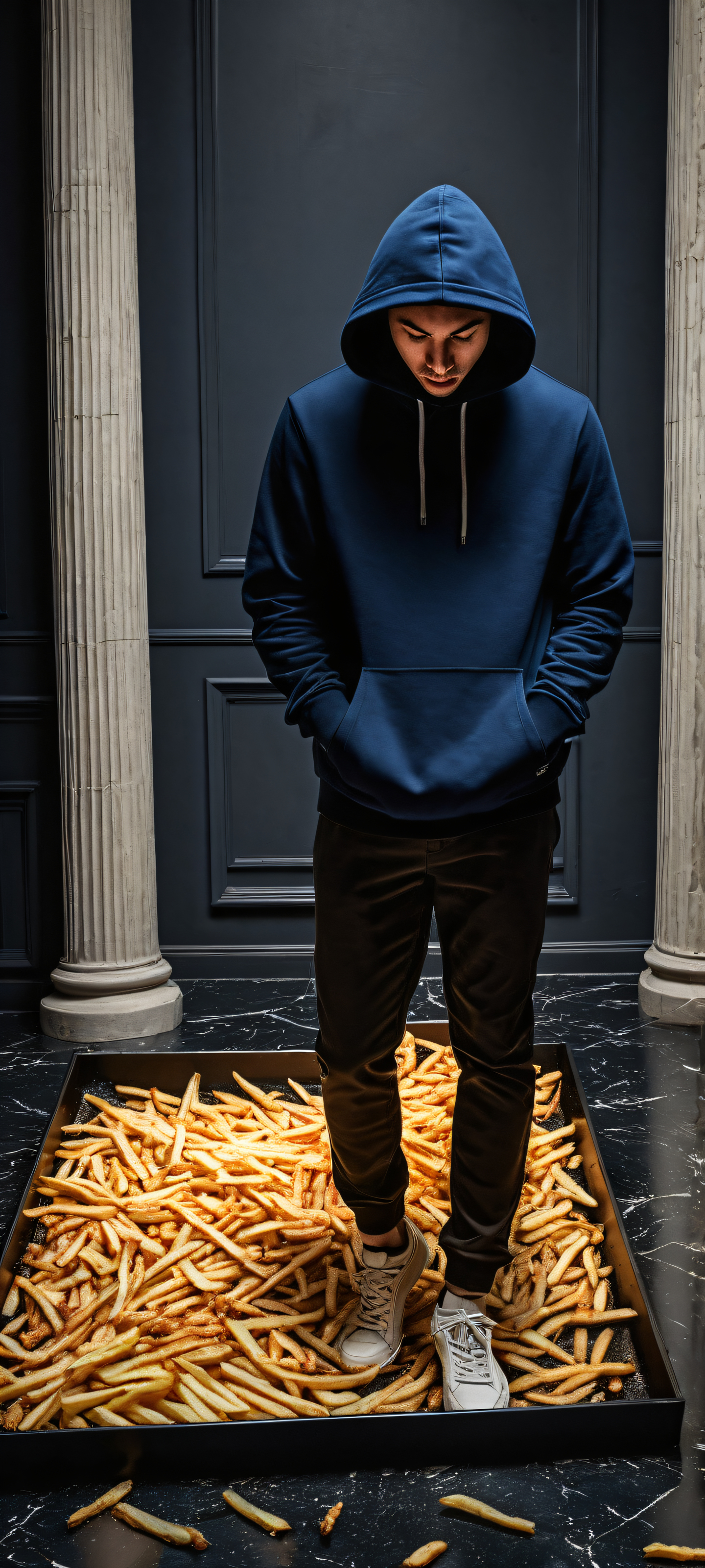 A breathtaking vertical portrait artwork of A hapless gamer is placed in the lower-middle, intricate micro-details of his black civitai hoodie, tripping and spilling a tray full of ram sticks and GPUs all over the floor as fries scatter across the floor., A perfectly clean and empty top half with vast pure void, allowing for unobstructed UI breathing space, gradually giving way to a messy, detailed, and humorous scene below, Award-winning digital art, pristine clarity, with stunning visual impact and texture, Deep perfect blacks, striking crisp contrast, and elegant luminescent accents in Dark Mode, avoiding cinematic lighting effects, Dominant colors: Midnight blue (#212121) and Metallic silver (#B1B1B1), with subtle hints of warm beige (#F5F5DC), elegant low-key lighting, deep perfect blacks, striking contrast, sleek dark mode aesthetic, luminescent accents, deep rich colors, portrait composition, centered subject in the lower middle, perfectly clean and smooth top half for UI, extreme depth of field blurred background, highly textured surfaces, intricate micro-details, physically based rendering, award-winning digital art, epic breathtaking scale, stunning visual impact, perfect composition, macOS wallpaper aesthetic, masterpiece, 2K QHD resolution, 9:20 aspect ratio.