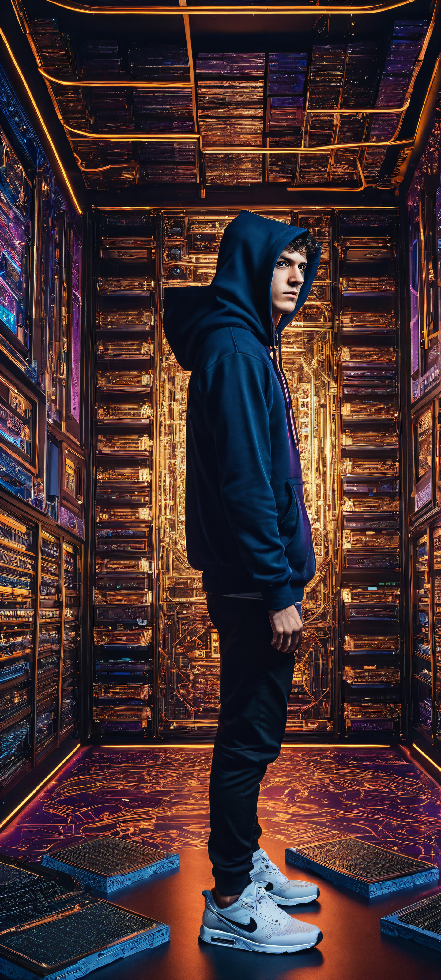 A breathtaking vertical portrait artwork of A hapless gamer, clad in his black Civitai hoodie, is placed in the lower-middle of the wallpaper, tripping and spilling a tray full of ram sticks and GPUs all over the floor, with intricate micro-details revealing the complexity of the scattered hardware., The background features a perfectly clean and empty top half, with a vast pure void creating a sense of depth and dimensionality, contrasting beautifully with the chaotic scene unfolding in the lower-middle., Award-winning digital art, stunning visual impact, with a focus on realistic textures and attention to detail, blending seamlessly into the pristine clarity of the overall image., Ethereal lighting illuminates the entire scene, with soft, radiant colors and ray-traced reflections adding to the overall sense of realism, while the bright and airy quality of the environment creates a sense of space and freedom., The dominant color palette is a mix of deep blues and purples, reflecting the high-tech nature of the scattered hardware, with subtle touches of warm golden tones adding a hint of humor and playfulness to the overall mood., ethereal lighting, radiant, brilliant colors, ray traced reflections, pristine clarity, portrait composition, centered subject in the lower middle, perfectly clean and smooth top half for UI, extreme depth of field blurred background, highly textured surfaces, intricate micro-details, physically based rendering, award-winning digital art, epic breathtaking scale, stunning visual impact, perfect composition, macOS wallpaper aesthetic, masterpiece, 2K QHD resolution, 9:20 aspect ratio.