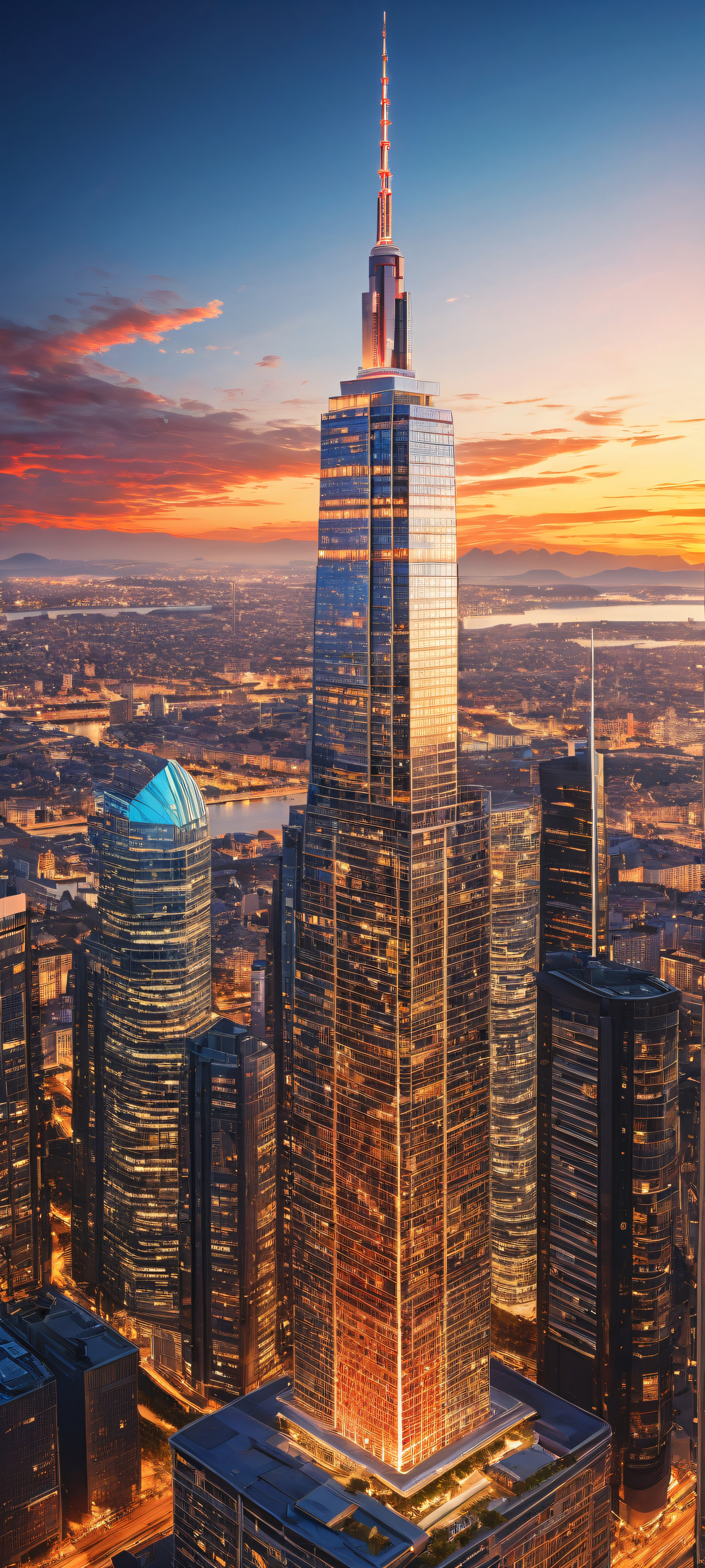 A breathtaking vertical portrait artwork of A majestic skyscraper placed in the lower-middle, intricate micro-details of urban architecture and city lights, Perfectly clean and empty top half with vast pure void, giving way to a breathtaking ultrawide view of the German city skyline, Award-winning digital art with pristine clarity and stunning visual impact, showcasing mastery of texture and scale, Ethereal with radiant colors, ray-traced reflections, and crisp clarity, capturing the essence of an epic sunset on the horizon, #3498DB, ethereal lighting, radiant, brilliant colors, ray traced reflections, pristine clarity, portrait composition, centered subject in the lower middle, perfectly clean and smooth top half for UI, extreme depth of field blurred background, highly textured surfaces, intricate micro-details, physically based rendering, award-winning digital art, epic breathtaking scale, stunning visual impact, perfect composition, macOS wallpaper aesthetic, masterpiece, 2K QHD resolution, 9:20 aspect ratio.