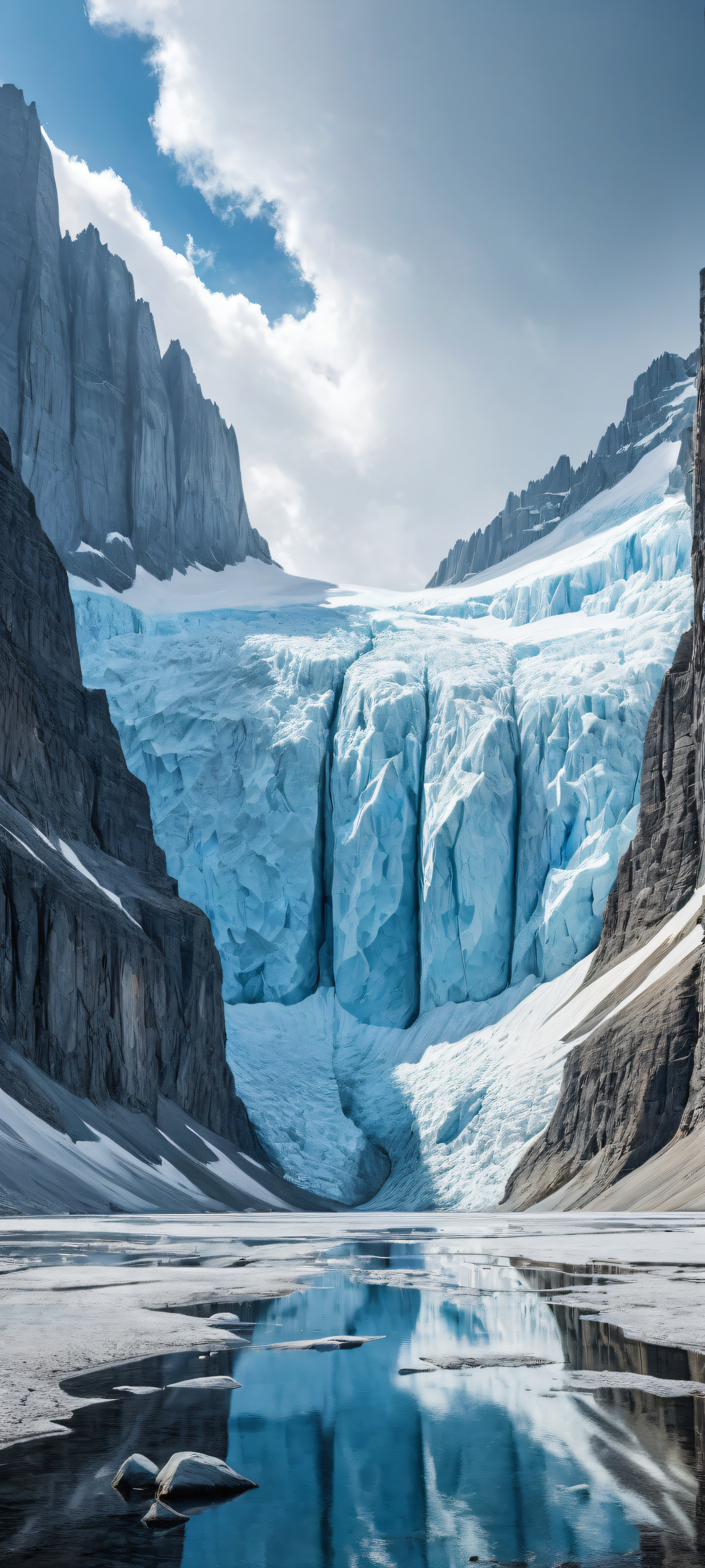 A breathtaking vertical portrait artwork of Glaciers placed in the lower-middle with intricate micro-details, A photograph taken on a prairie with a perfectly clean and empty top half and vast pure void, allowing for an unobstructed view of the glaciers in the lower-middle, Award-winning digital art, pristine clarity, showcasing the beauty of nature, Ethereal lightning illuminating the scene with radiant, brilliant colors and ray-traced reflections, creating an otherworldly ambiance, [‘Cerulean Blue’, ‘Pristine White’, ‘Misty Grey’, ‘Rainy Wet Asphalt’], ethereal lighting, radiant, brilliant colors, ray traced reflections, pristine clarity, portrait composition, centered subject in the lower middle, perfectly clean and smooth top half for UI, extreme depth of field blurred background, highly textured surfaces, intricate micro-details, physically based rendering, award-winning digital art, epic breathtaking scale, stunning visual impact, perfect composition, macOS wallpaper aesthetic, masterpiece, 2K QHD resolution, 9:20 aspect ratio.