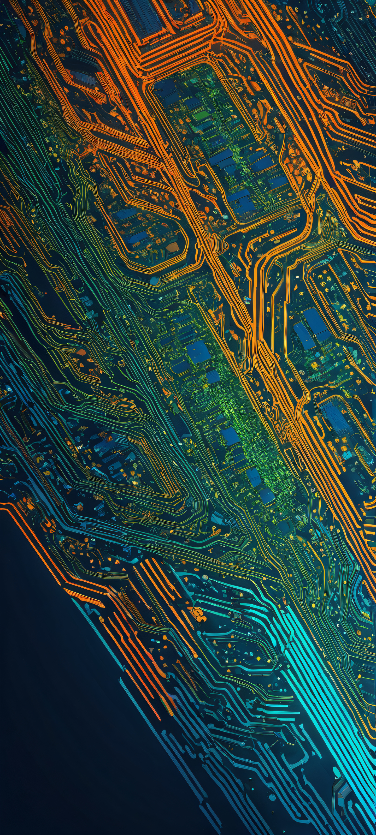 A breathtaking vertical portrait artwork of placed in the lower-middle, intricate micro-details of glowing circuit boards, perfectly clean and empty top half with vast pure void, contrasted by a dark blue-gray background, award-winning digital art, pristine clarity with precision-cut geometric shapes and vibrant neon hues, ethereal, brilliant colors radiate from the subject’s glowing edges, with ray-traced reflections that shimmer in perfect harmony, pulsating neon blues (#03A9F4), electric greens (#34C759), and fiery oranges (#FF9900) create a mesmerizing color palette, ethereal lighting, radiant, brilliant colors, ray traced reflections, pristine clarity, portrait composition, centered subject in the lower middle, perfectly clean and smooth top half for UI, extreme depth of field blurred background, highly textured surfaces, intricate micro-details, physically based rendering, award-winning digital art, epic breathtaking scale, stunning visual impact, perfect composition, macOS wallpaper aesthetic, masterpiece, 2K QHD resolution, 9:20 aspect ratio.