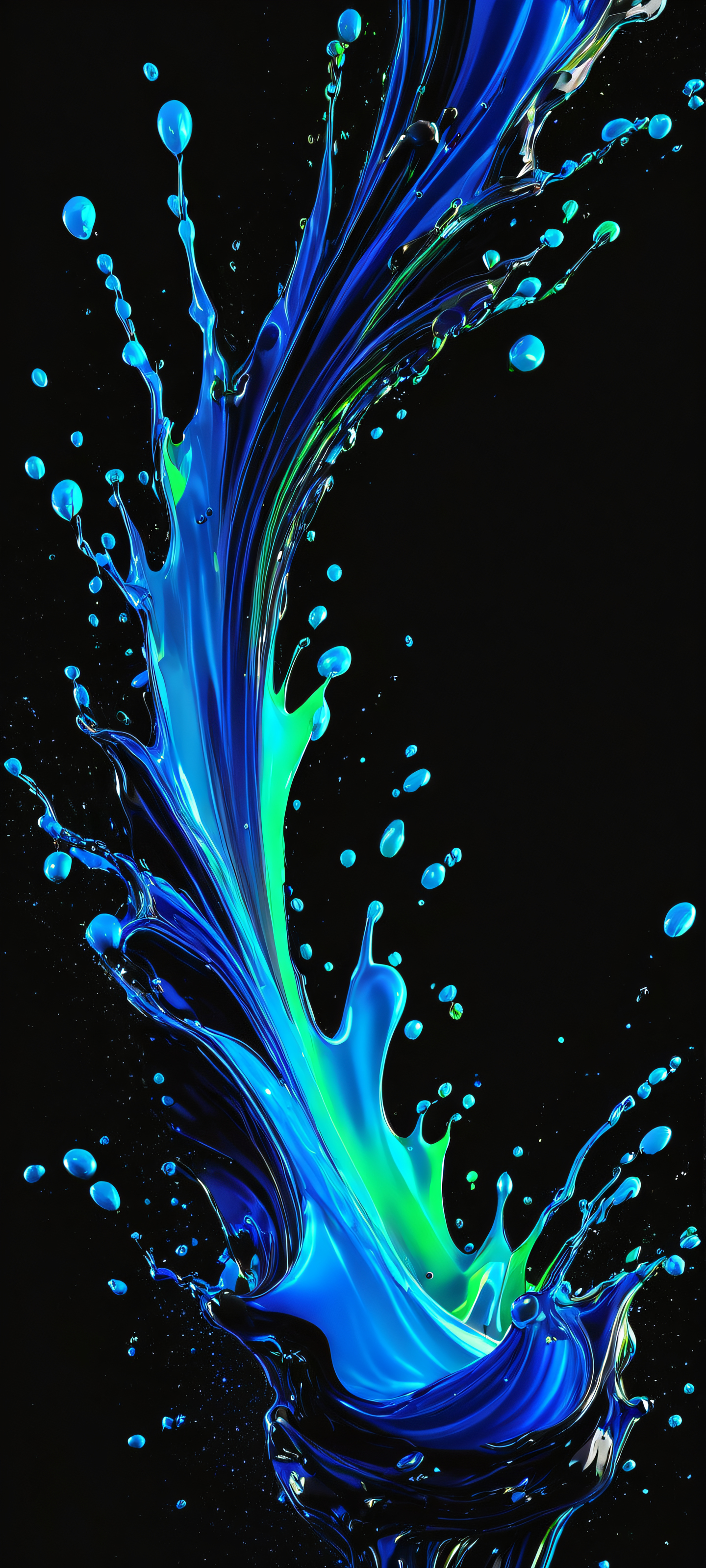 Elevate your phone’s home screen with this stunning masterpiece. This 2K QHD resolution wallpaper features mesmerizing liquid splashes in a dark pure black background, accented by electric blue and luminous green hues. Perfectly optimized for high-quality displays on iPhone, Samsung Galaxy, and Android devices.