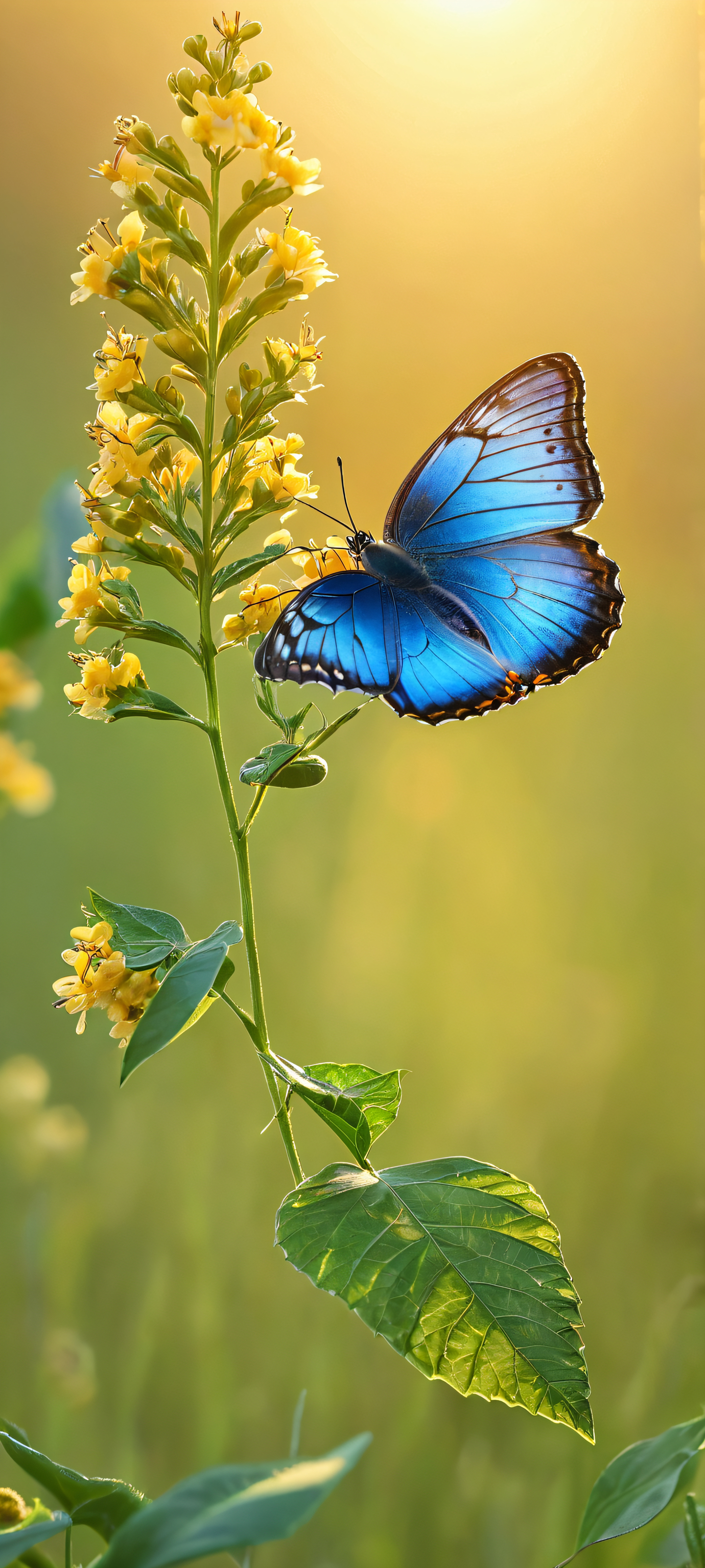 A stunning butterfly perched on a leaf amidst a vibrant floral meadow under the warm golden hour light, perfectly optimized for iPhone and Android home screens.