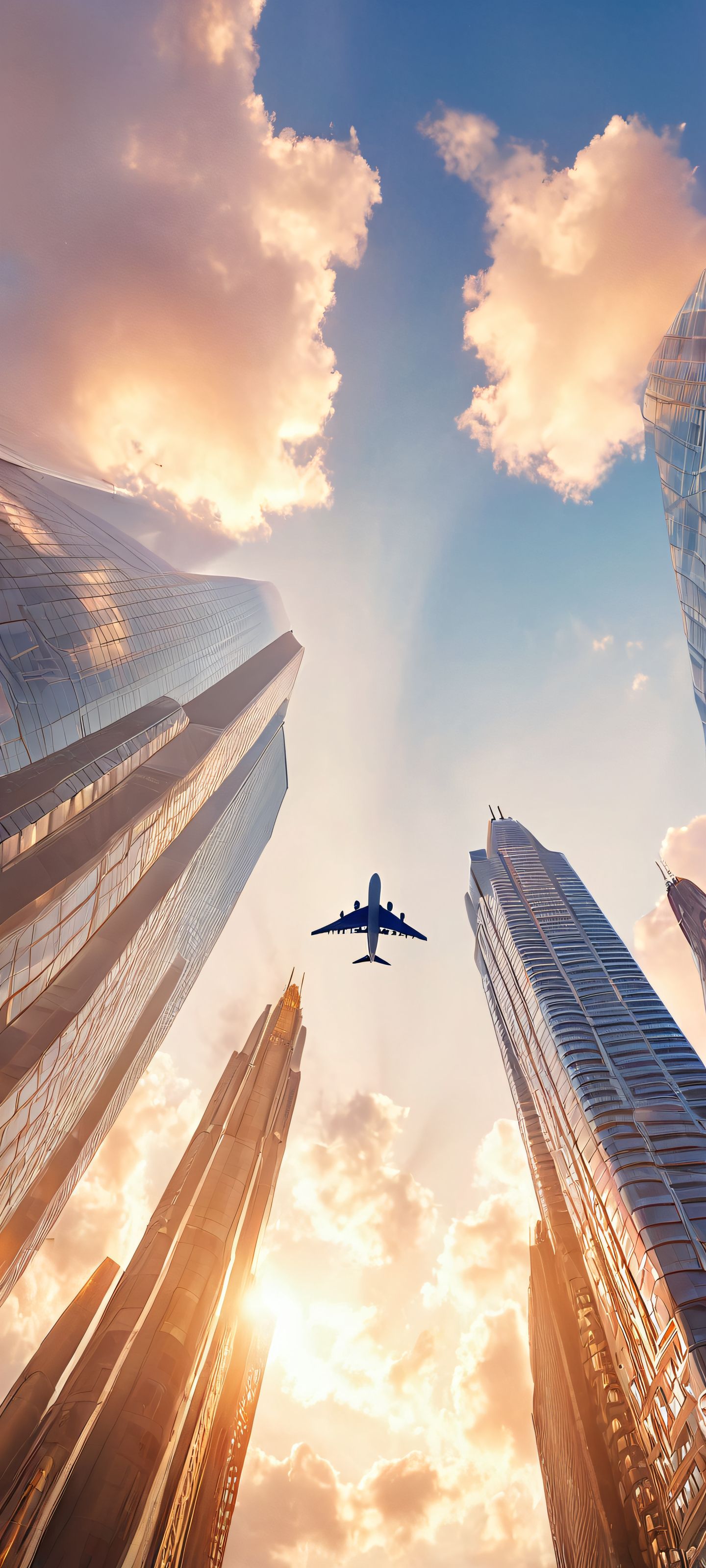 Elevate your mobile experience with this breathtaking vertical wallpaper, perfectly optimized for iPhone, Samsung Galaxy, and Android home screens. The airliner soars above a majestic cityscape, bathed in the soft golden light of sunset. The cloudy skies and high-rise buildings create a stunning contrast, making this masterpiece a must-have for any urban enthusiast.