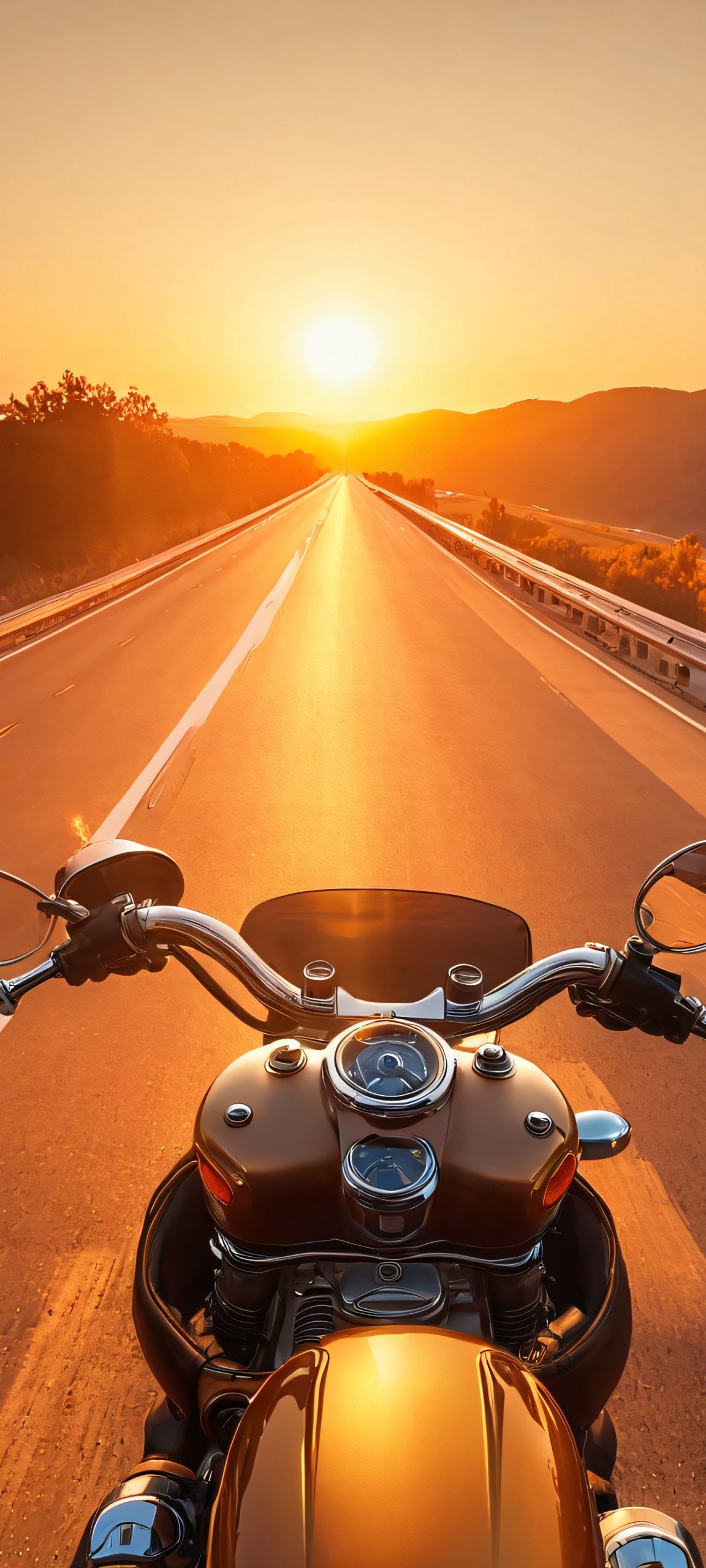 Transform your mobile device into a masterpiece with this breathtaking 2K QHD wallpaper of a motorcycle on a sunset highway. Highly detailed and beautifully rendered in warm pastel hues, this image is perfectly optimized for iPhone, Samsung Galaxy, and Android home screens.