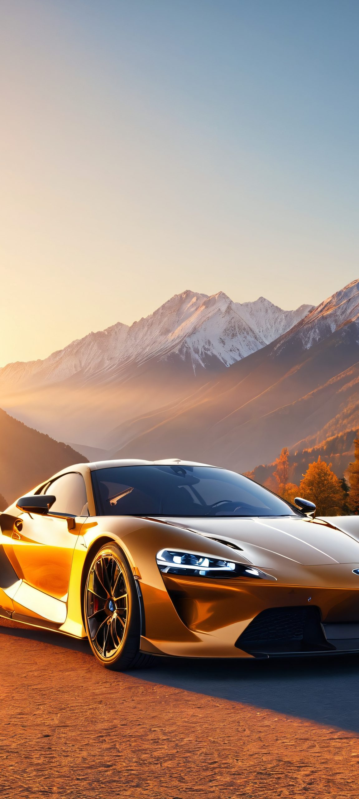 Elevate your mobile experience with this stunning vertical wallpaper, perfectly optimized for iPhone, Samsung Galaxy, and Android home screens. Let the breathtaking scenery of a car navigating a winding mountain road during golden hour transport you to a serene winter wonderland.