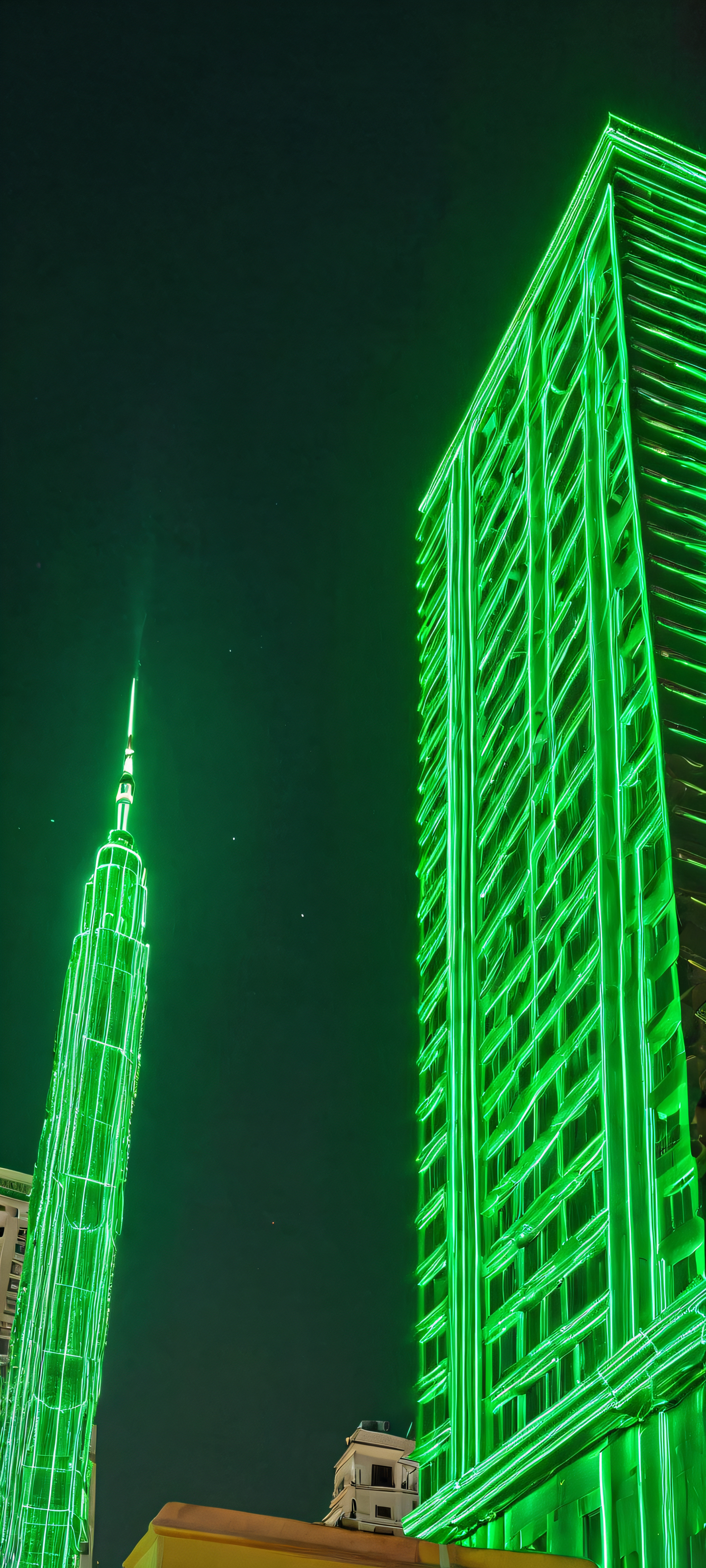 A stunning vertical cityscape at night featuring a masterpiece of green lights, perfect for your iPhone or Android home screen.