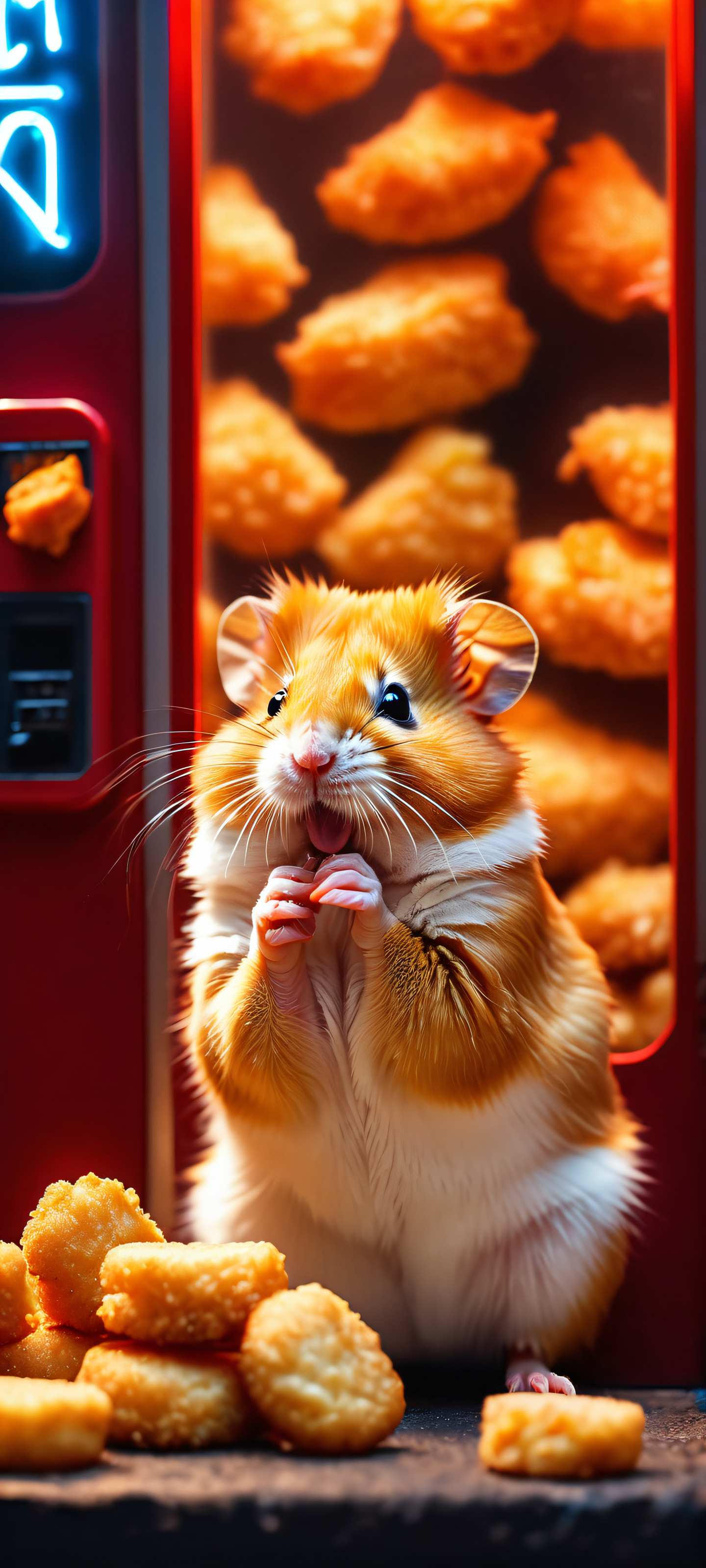 Get ready to be mesmerized by this stunning 2K QHD wallpaper of hamster-shaped chicken nuggets illuminated by the bright glow of a vending machine at night. This masterpiece is perfectly optimized for your iPhone, Samsung Galaxy, or any Android device’s home screen, bringing a touch of vibrancy and fun to your daily mobile experience.