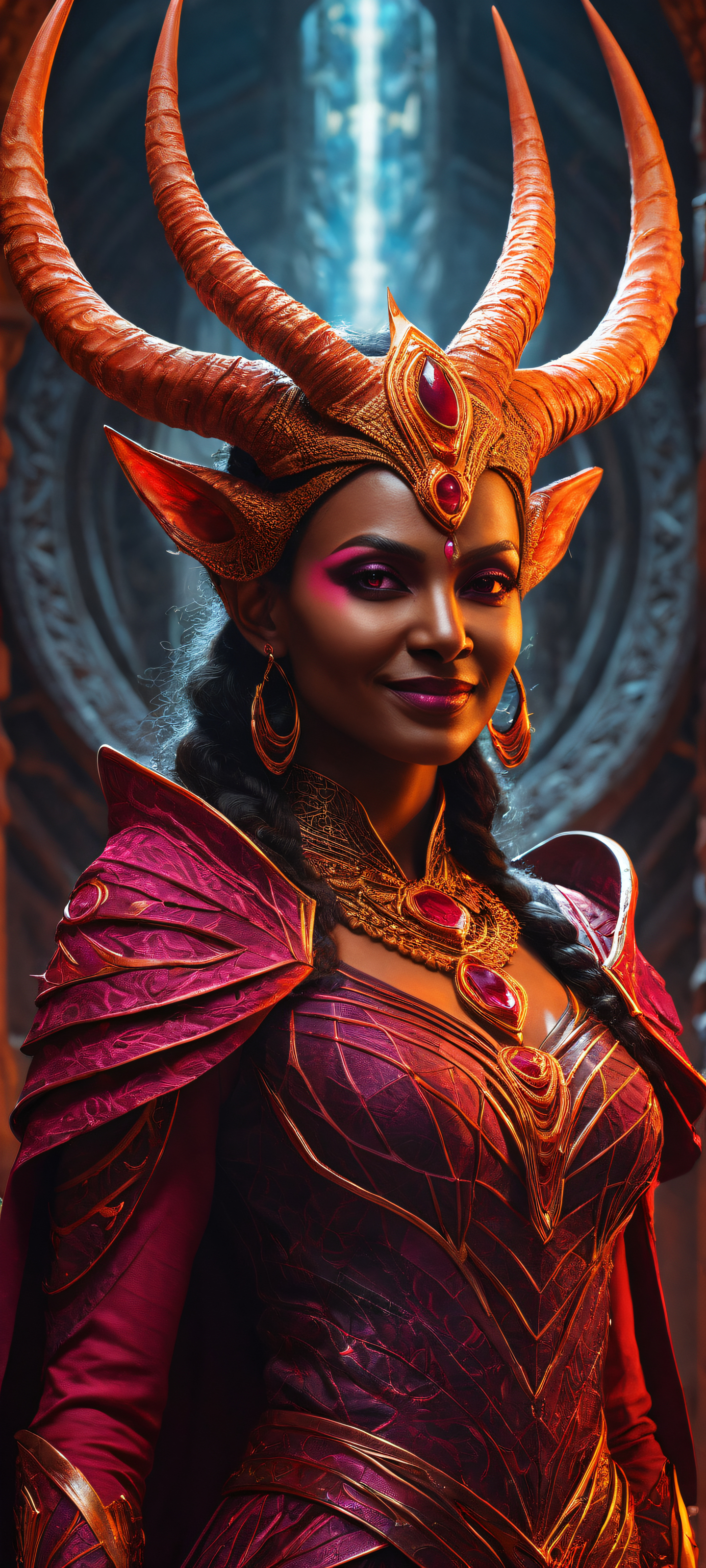 A breathtaking vertical portrait artwork of Horned Queen placed in the lower-middle, intricate micro-details of her twisted horns, glowing eyes, and maniacal smile, Perfectly clean and empty top half with vast pure void, descending into a burning apocalyptic chasm below the infinite spiral staircase, Award-winning digital art, pristine clarity with insane attention to detail, Ethereal lighting with intense orange and magenta hues, radiant ray-traced reflections, and brilliant color clarity, [‘Deep Crimson’, ‘Electric Magenta’, ‘Dark Charcoal’], ethereal lighting, radiant, brilliant colors, ray traced reflections, pristine clarity, portrait composition, centered subject in the lower middle, perfectly clean and smooth top half for UI, extreme depth of field blurred background, highly textured surfaces, intricate micro-details, physically based rendering, award-winning digital art, epic breathtaking scale, stunning visual impact, perfect composition, macOS wallpaper aesthetic, masterpiece, 2K QHD resolution, 9:20 aspect ratio.