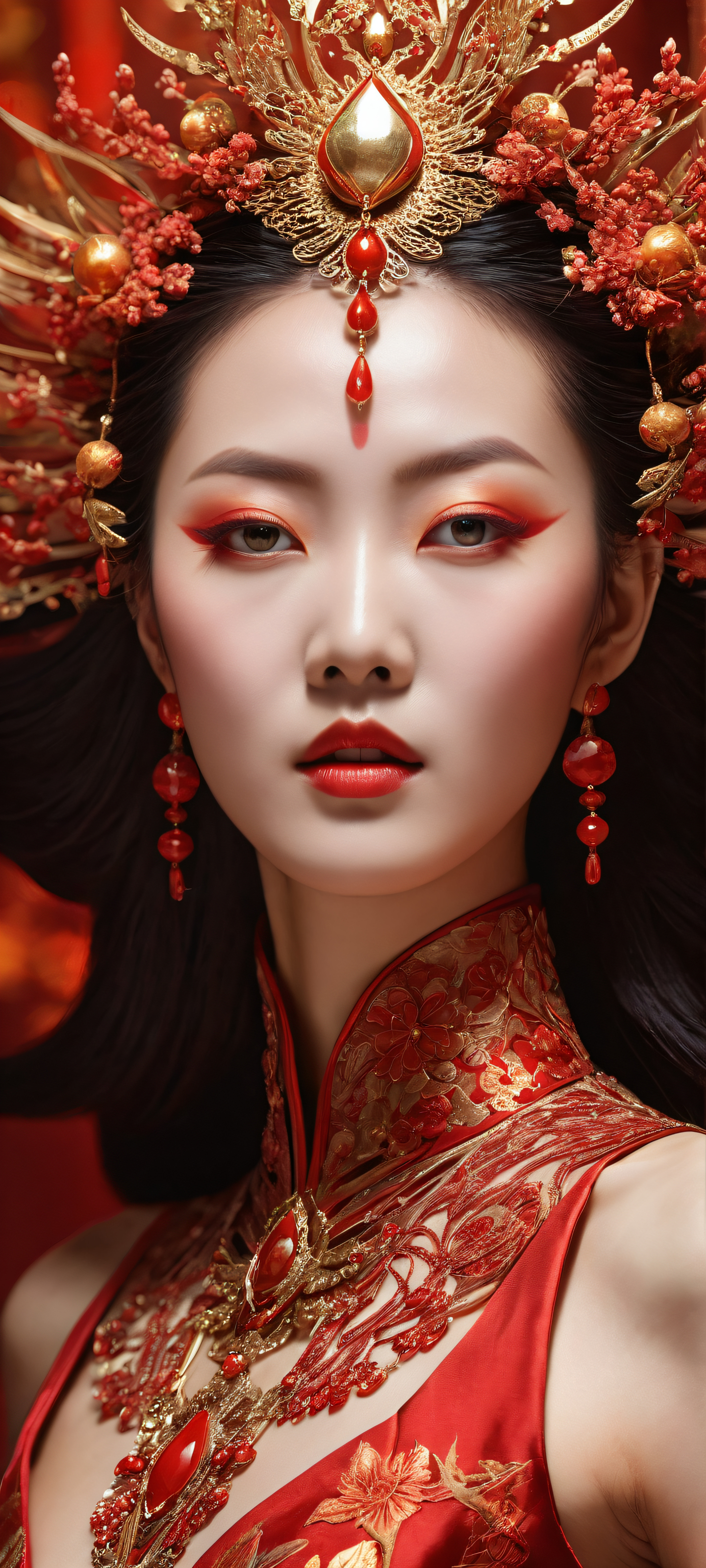 A breathtaking vertical portrait artwork of Hu Tao placed in the lower-middle with insane micro-details of her intricate wig and makeup, Perfectly clean and empty top half with vast pure void, giving way to a dramatic vertical perspective, Award-winning digital art, stunning visual impact, and pristine clarity, rivaling high-end video game graphics, Ethereal lighting with radiant, brilliant colors and ray-traced reflections that create an otherworldly glow, Dominant red hues and warm tones, evoking the fiery passion of Hu Tao’s character, ethereal lighting, radiant, brilliant colors, ray traced reflections, pristine clarity, portrait composition, centered subject in the lower middle, perfectly clean and smooth top half for UI, extreme depth of field blurred background, highly textured surfaces, intricate micro-details, physically based rendering, award-winning digital art, epic breathtaking scale, stunning visual impact, perfect composition, macOS wallpaper aesthetic, masterpiece, 2K QHD resolution, 9:20 aspect ratio.