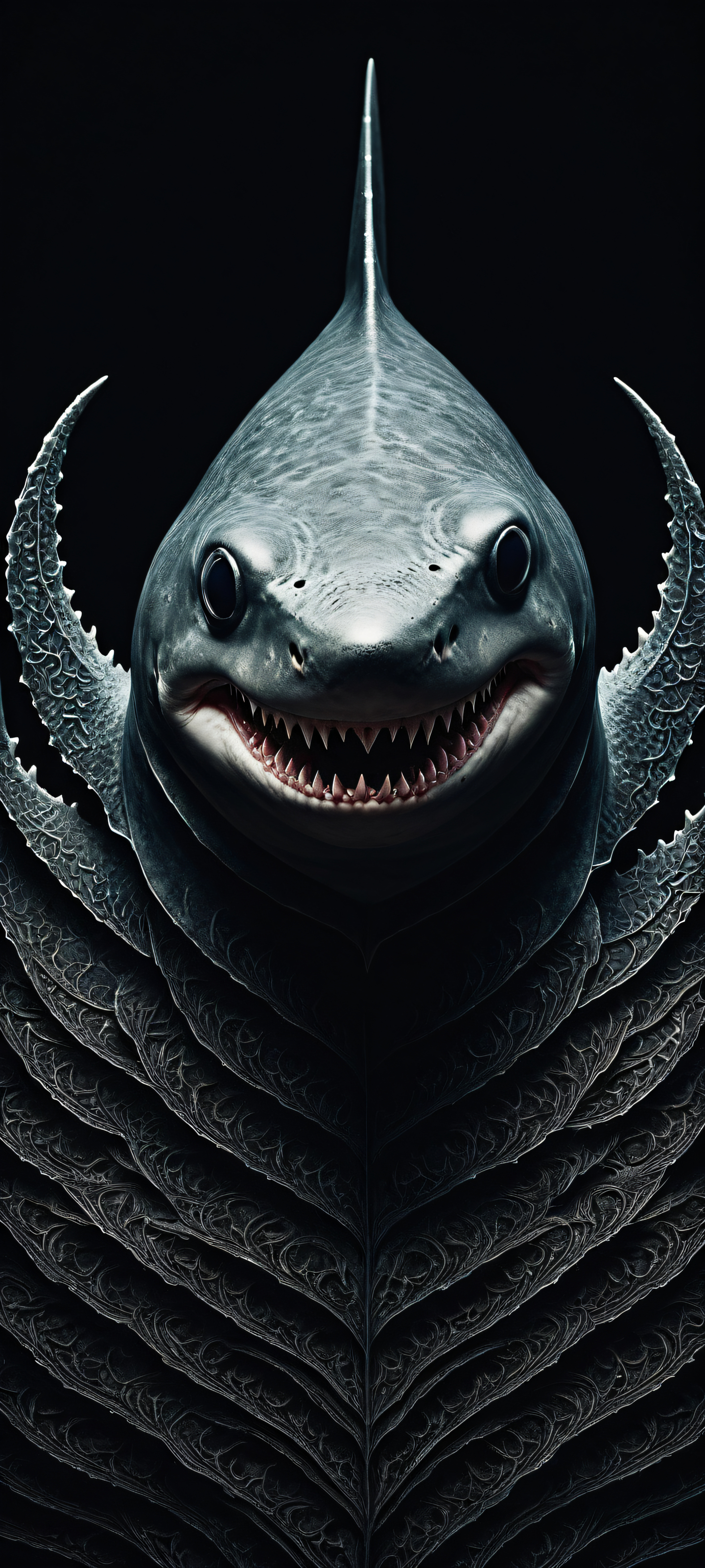 A breathtaking vertical portrait artwork of A stylized IKEA Blahaj Shark, placed in the lower-middle with intricate micro-details, as if it were an axolotl instead, Perfectly clean and empty top half with vast pure void, contrasting beautifully with the intricate subject below, Award-winning digital art, pristine clarity, and a masterclass in subtle texture play, Deep dark mode aesthetic, striking crisp contrast between light and shadow, with elegant luminescent accents to guide the eye, #2E3440 (#534C4D), #627200 (#8FBCBB), and touches of #455A64 for a moody yet sophisticated color palette, elegant low-key lighting, deep perfect blacks, striking contrast, sleek dark mode aesthetic, luminescent accents, deep rich colors, portrait composition, centered subject in the lower middle, perfectly clean and smooth top half for UI, extreme depth of field blurred background, highly textured surfaces, intricate micro-details, physically based rendering, award-winning digital art, epic breathtaking scale, stunning visual impact, perfect composition, macOS wallpaper aesthetic, masterpiece, 2K QHD resolution, 9:20 aspect ratio.