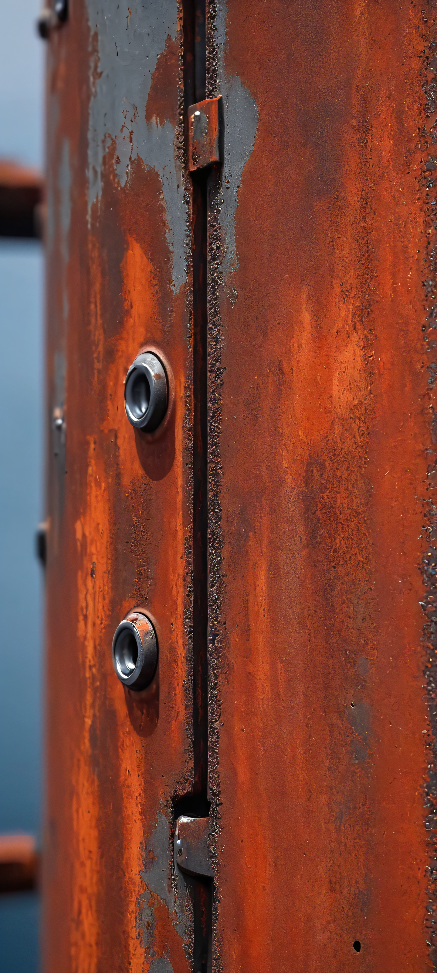 Rustic battleship gray and faded red tones create a striking macro view of industrial machinery on an iPhone or Android home screen.