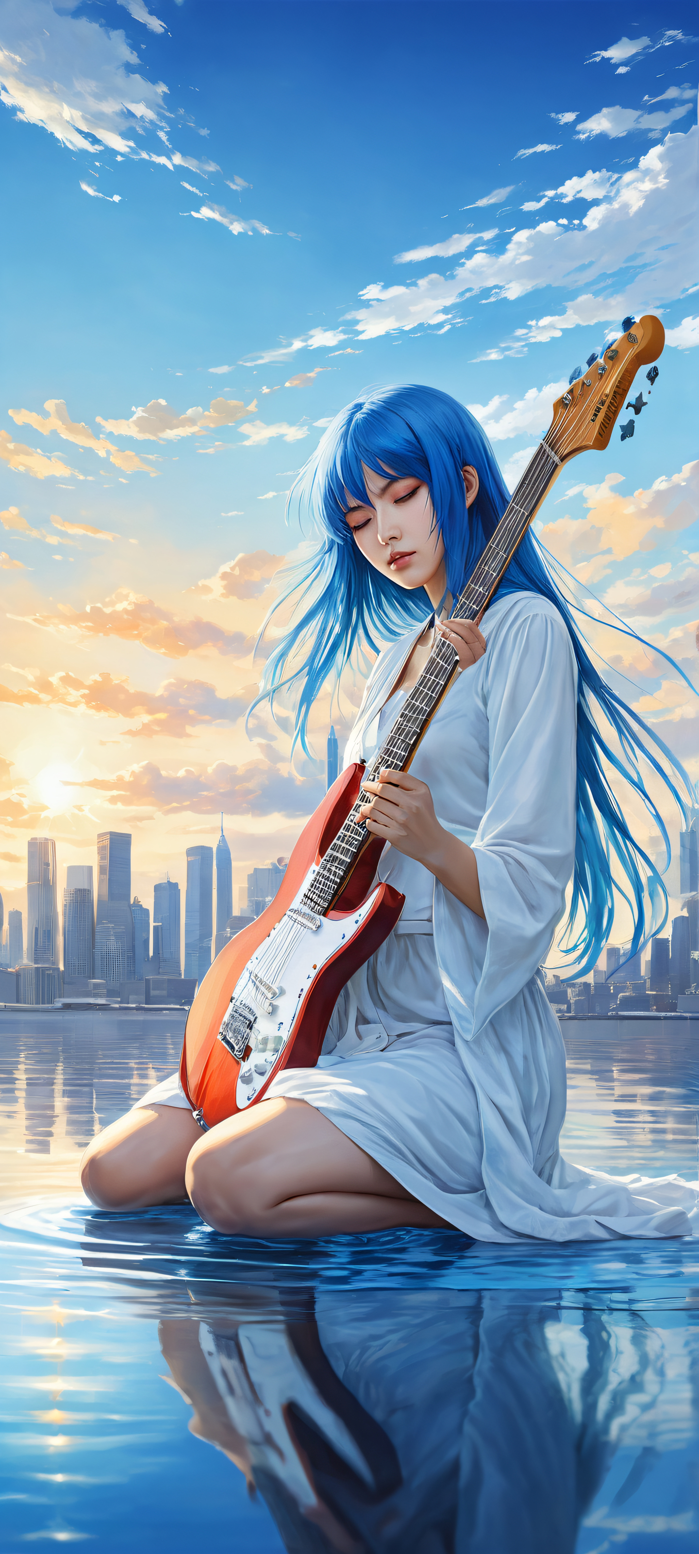 A breathtaking vertical portrait artwork of Aku No Kyouma placed in the lower-middle, intricate micro-details of her blue-hair and eyes, surrounded by an aura of celestial music., Perfectly clean and empty top half with vast pure void, contrasted with the vibrant underwater cityscape below, where Akame is kneeling on one leg while holding her electric guitar., Award-winning digital art, 原始的な透明度, blending watercolor-inspired textures with a touch of ethereal lighting., Ethereal softbox lighting with radiant blue accents, tracing reflections off the water’s surface and Aku No Kyouma’s hair, creating a sense of depth and dimensionality., #4567b7, #34a85a, #87ceeb, ethereal lighting, radiant, brilliant colors, ray traced reflections, 原始的な透明度, portrait composition, centered subject in the lower middle, perfectly clean and smooth top half for UI, extreme depth of field blurred background, highly textured surfaces, intricate micro-details, physically based rendering, award-winning digital art, epic breathtaking scale, stunning visual impact, perfect composition, macOS wallpaper aesthetic, masterpiece, 2K QHD resolution, 9:20 aspect ratio.