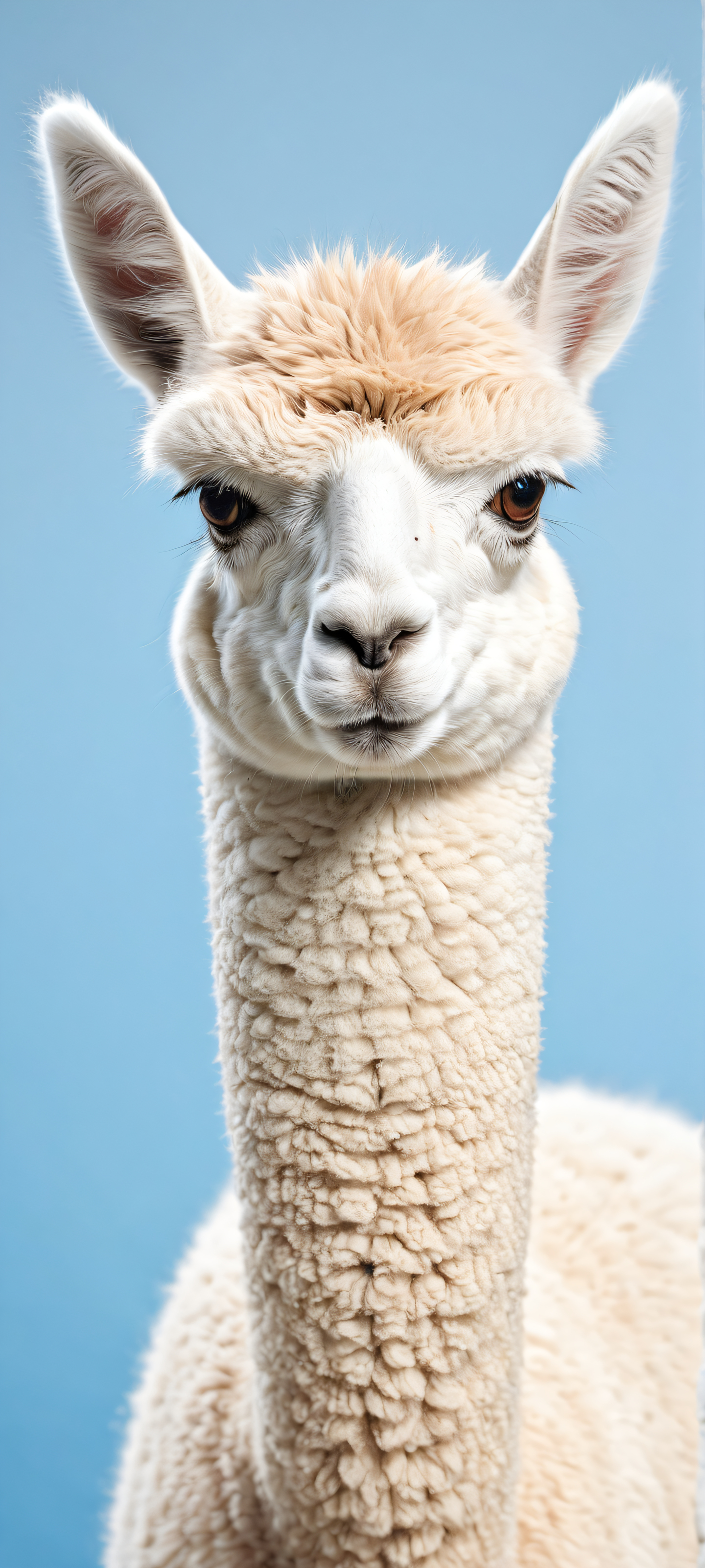 A breathtaking vertical portrait artwork of Alpaca XD placed in the lower-middle with insane intricate micro-details, Perfectly clean and empty top half with vast pure void, detailed background of dynamic angle, Award-winning digital art, stunning visual impact, and pristine clarity, Ethereal lighting with radiant, brilliant colors, ray-traced reflections, and pristine clarity, Soft pastel hues of pale blue and cream, accentuated by subtle metallic sheens, ethereal lighting, radiant, brilliant colors, ray traced reflections, 原始的な透明度, portrait composition, centered subject in the lower middle, perfectly clean and smooth top half for UI, extreme depth of field blurred background, highly textured surfaces, intricate micro-details, physically based rendering, award-winning digital art, epic breathtaking scale, stunning visual impact, perfect composition, macOS wallpaper aesthetic, masterpiece, 2K QHD resolution, 9:20 aspect ratio.