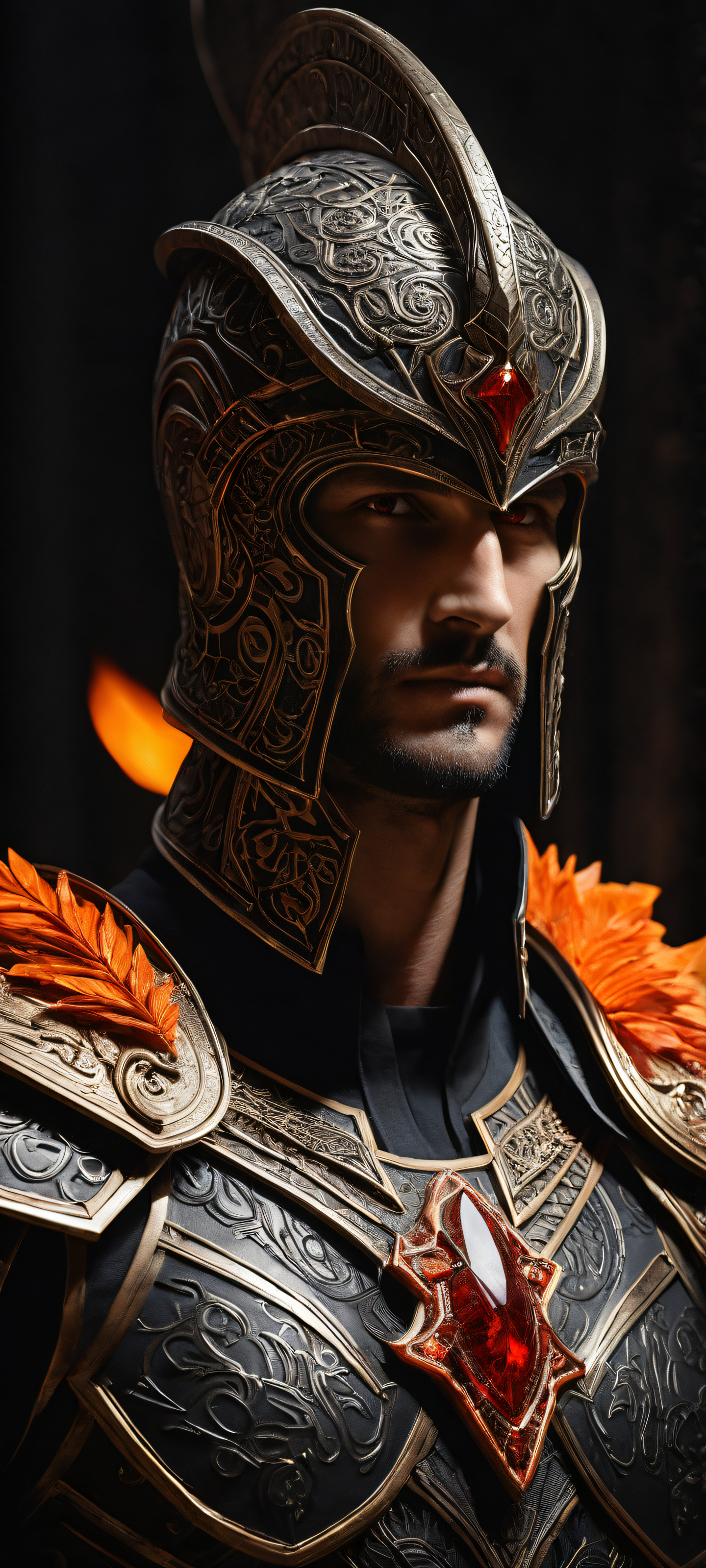A breathtaking vertical portrait artwork of Ares, placed in the lower-middle with insane micro-details, intricate symbols and armor plating, Perfectly clean and empty top half with vast pure void, minimalism at its finest, simple background allowing for epic visuals, Award-winning digital art, 原始的な透明度, a true masterpiece, trending on Wallhaven, Deep perfect blacks, striking crisp contrast, elegant luminescent accents in dark mode aesthetic, Dominant dark tones with subtle hints of fiery reds and oranges, evoking the underworld’s intense heat, elegant low-key lighting, deep perfect blacks, striking contrast, sleek dark mode aesthetic, luminescent accents, deep rich colors, portrait composition, centered subject in the lower middle, perfectly clean and smooth top half for UI, extreme depth of field blurred background, highly textured surfaces, intricate micro-details, physically based rendering, award-winning digital art, epic breathtaking scale, stunning visual impact, perfect composition, macOS wallpaper aesthetic, masterpiece, 2K QHD resolution, 9:20 aspect ratio.