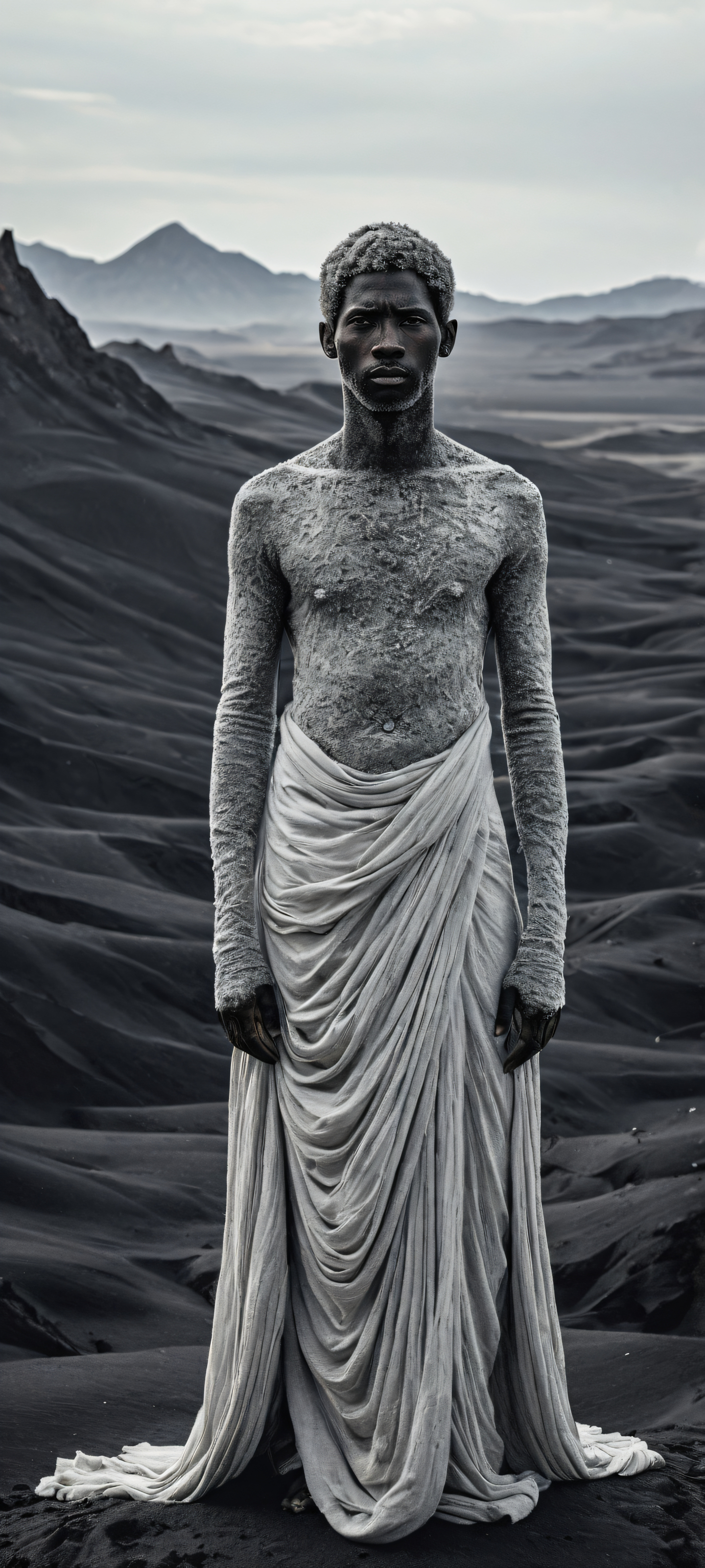 A breathtaking vertical portrait artwork of A figure, placed in the lower-middle with insane micro-details, covered in ash-like layered fabric with edges crumbling into particles, standing in an open barren land., The background features a perfectly clean and empty top half with vast pure void, allowing for unobstructed UI breathing space., Award-winning digital art, 原始的な透明度, and stunning visual impact reminiscent of Ghibli-inspired anime style., Deep perfect blacks dominate the scene, with crisp contrast and elegant luminescent accents casting an eerie yet atmospheric glow., Dominant desaturated tones with muted greys and whites, evoking a sense of devastation and decay., elegant low-key lighting, deep perfect blacks, striking contrast, sleek dark mode aesthetic, luminescent accents, deep rich colors, portrait composition, centered subject in the lower middle, perfectly clean and smooth top half for UI, extreme depth of field blurred background, highly textured surfaces, intricate micro-details, physically based rendering, award-winning digital art, epic breathtaking scale, stunning visual impact, perfect composition, macOS wallpaper aesthetic, masterpiece, 2K QHD resolution, 9:20 aspect ratio.