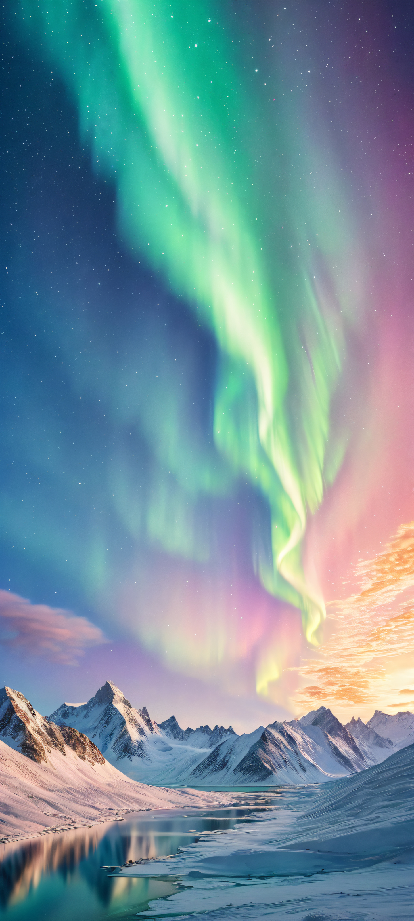 A breathtaking vertical portrait artwork of Aurora Borealis placed in the lower-middle, intricate micro-details of swirling clouds and solar flares, Perfectly clean and empty top half with vast pure void, and a stunning cosmic landscape unfolding from the middle to the bottom, Award-winning digital art, stunning visual impact, 原始的な透明度, エーテル的, radiant, brilliant colors, ray-traced reflections, and a sense of depth achieved through masterful use of lighting and shading, Pale blues and whites, with hints of pink and orange as the aurora borealis dances across the sky, ethereal lighting, radiant, brilliant colors, ray traced reflections, 原始的な透明度, portrait composition, centered subject in the lower middle, perfectly clean and smooth top half for UI, extreme depth of field blurred background, highly textured surfaces, intricate micro-details, physically based rendering, award-winning digital art, epic breathtaking scale, stunning visual impact, perfect composition, macOS wallpaper aesthetic, masterpiece, 2K QHD resolution, 9:20 aspect ratio.