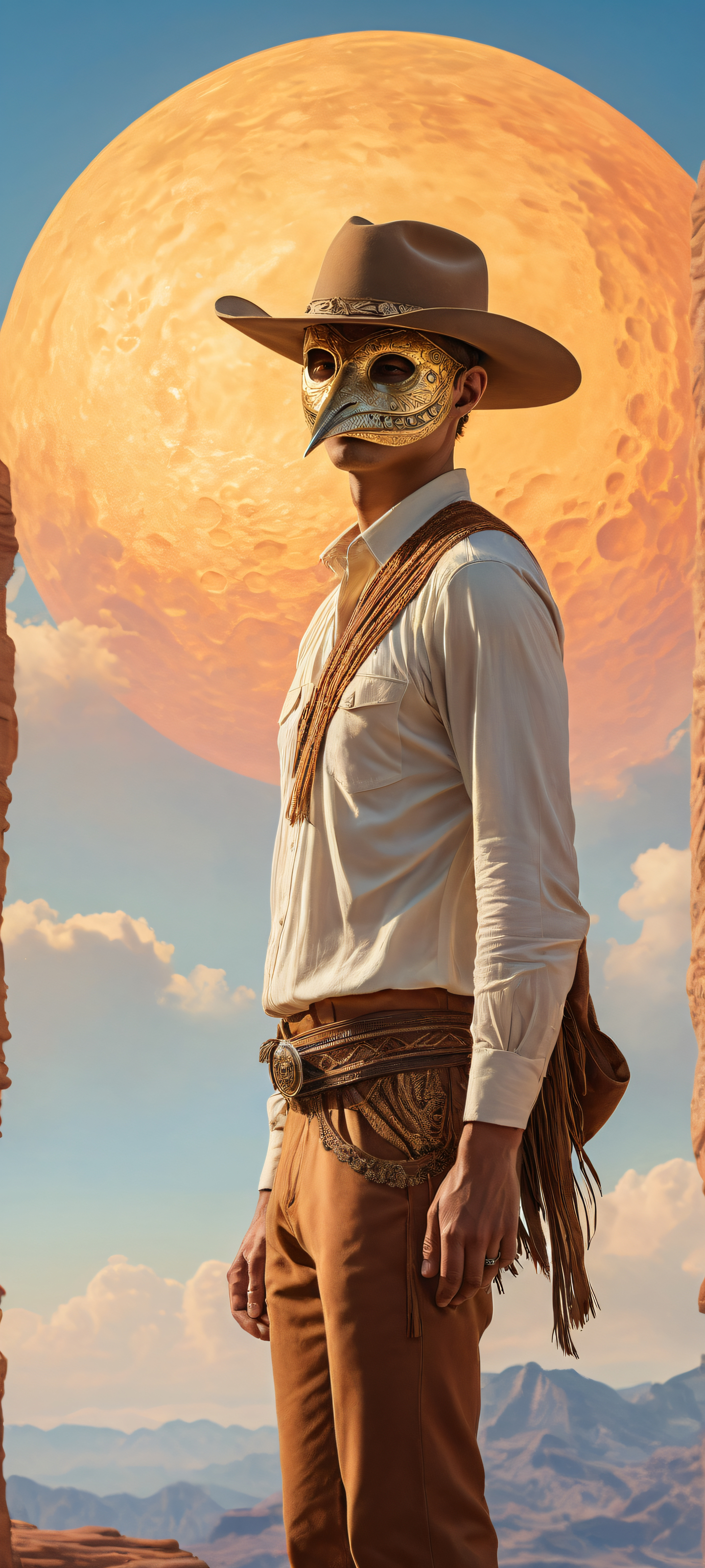 A breathtaking vertical portrait artwork of Bird Boy placed in the lower-middle with intricate micro-details of his mask and cowboy hat, Perfectly clean and empty top half with vast pure void, featuring a subtle gradient of blue sky at the very bottom, Award-winning digital art, stunning visual impact, with pristine clarity, Ethereal lighting with soft, radiant colors, ray-traced reflections, and flawless clarity, mimicking an otherworldly sunset, Dominant palette of earthy tones such as sienna, umber, and olive green, accented by a warm golden light, ethereal lighting, radiant, brilliant colors, ray traced reflections, 原始的な透明度, portrait composition, centered subject in the lower middle, perfectly clean and smooth top half for UI, extreme depth of field blurred background, highly textured surfaces, intricate micro-details, physically based rendering, award-winning digital art, epic breathtaking scale, stunning visual impact, perfect composition, macOS wallpaper aesthetic, masterpiece, 2K QHD resolution, 9:20 aspect ratio.