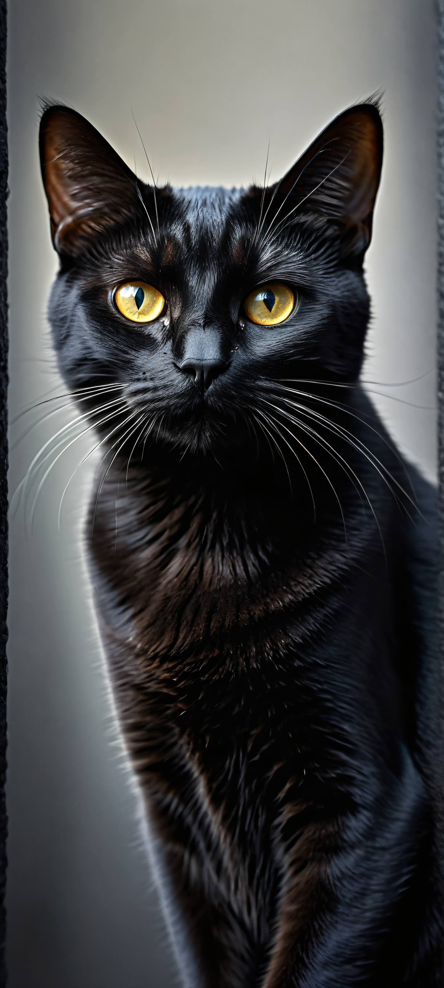 A breathtaking vertical portrait artwork of A black cat with impossibly large, luminous eyes stands placed in the lower-middle, intricate micro-details, Perfectly clean and empty top half with vast pure void, a star-dotted backdrop below, Award-winning digital art, stunning visual impact, 原始的な透明度, Deep perfect blacks, striking crisp contrast, and elegant luminescent accents in sleek dark mode aesthetic, Predominantly dark blues and grays, with pops of bright whites and glowing yellows, elegant low-key lighting, deep perfect blacks, striking contrast, sleek dark mode aesthetic, luminescent accents, deep rich colors, portrait composition, centered subject in the lower middle, perfectly clean and smooth top half for UI, extreme depth of field blurred background, highly textured surfaces, intricate micro-details, physically based rendering, award-winning digital art, epic breathtaking scale, stunning visual impact, perfect composition, macOS wallpaper aesthetic, masterpiece, 2K QHD resolution, 9:20 aspect ratio.