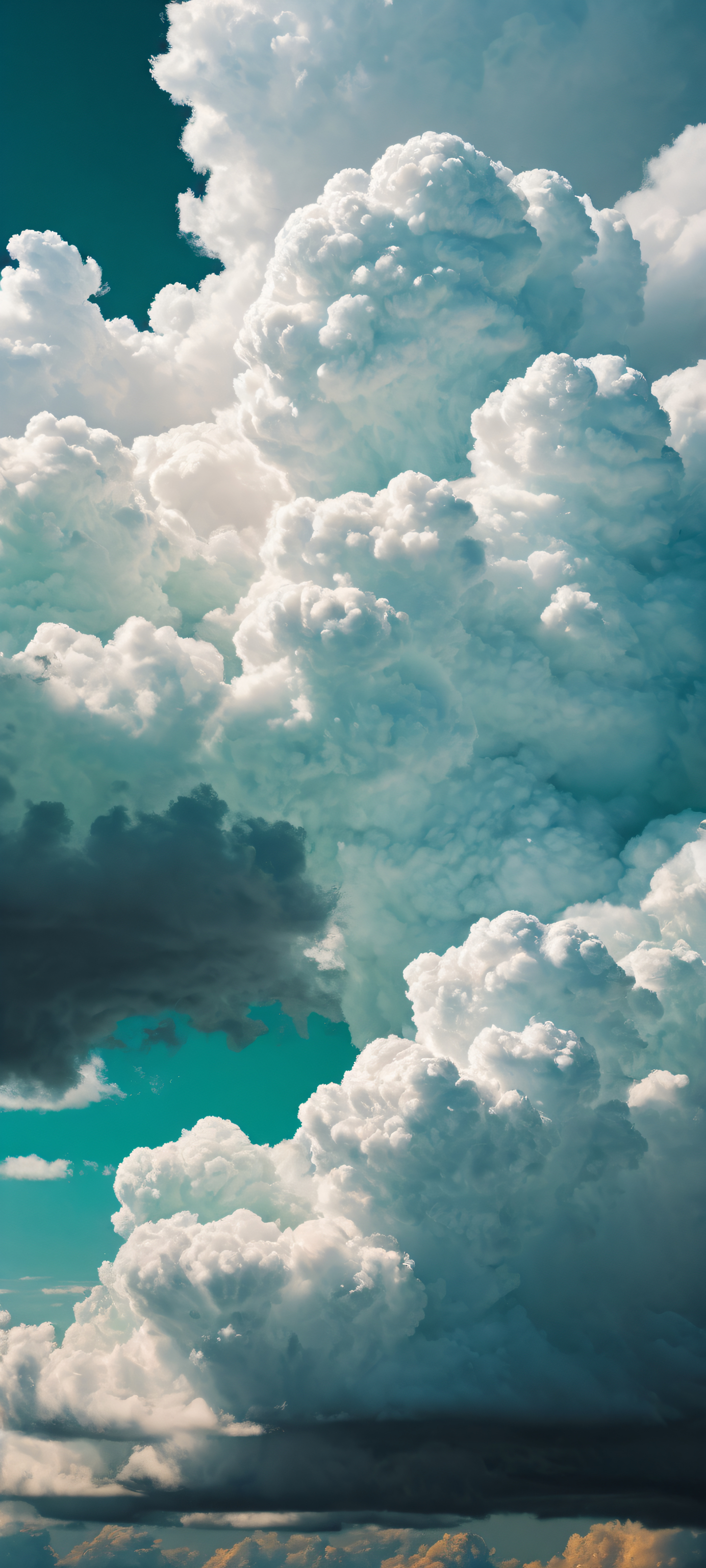 A breathtaking vertical portrait artwork of Cloud Formation placed in the lower-middle with intricate micro-details, Perfectly clean and empty top half with vast pure void, featuring a cloud-filled sky, Award-winning digital art, stunning visual impact, and pristine clarity, Sleek dark mode aesthetic, deep perfect blacks, striking crisp contrast, and elegant luminescent accents, #F5F5F5 (Cream), #34A85A (Mint Green), elegant low-key lighting, deep perfect blacks, striking contrast, sleek dark mode aesthetic, luminescent accents, deep rich colors, portrait composition, centered subject in the lower middle, perfectly clean and smooth top half for UI, extreme depth of field blurred background, highly textured surfaces, intricate micro-details, physically based rendering, award-winning digital art, epic breathtaking scale, stunning visual impact, perfect composition, macOS wallpaper aesthetic, masterpiece, 2K QHD resolution, 9:20 aspect ratio.