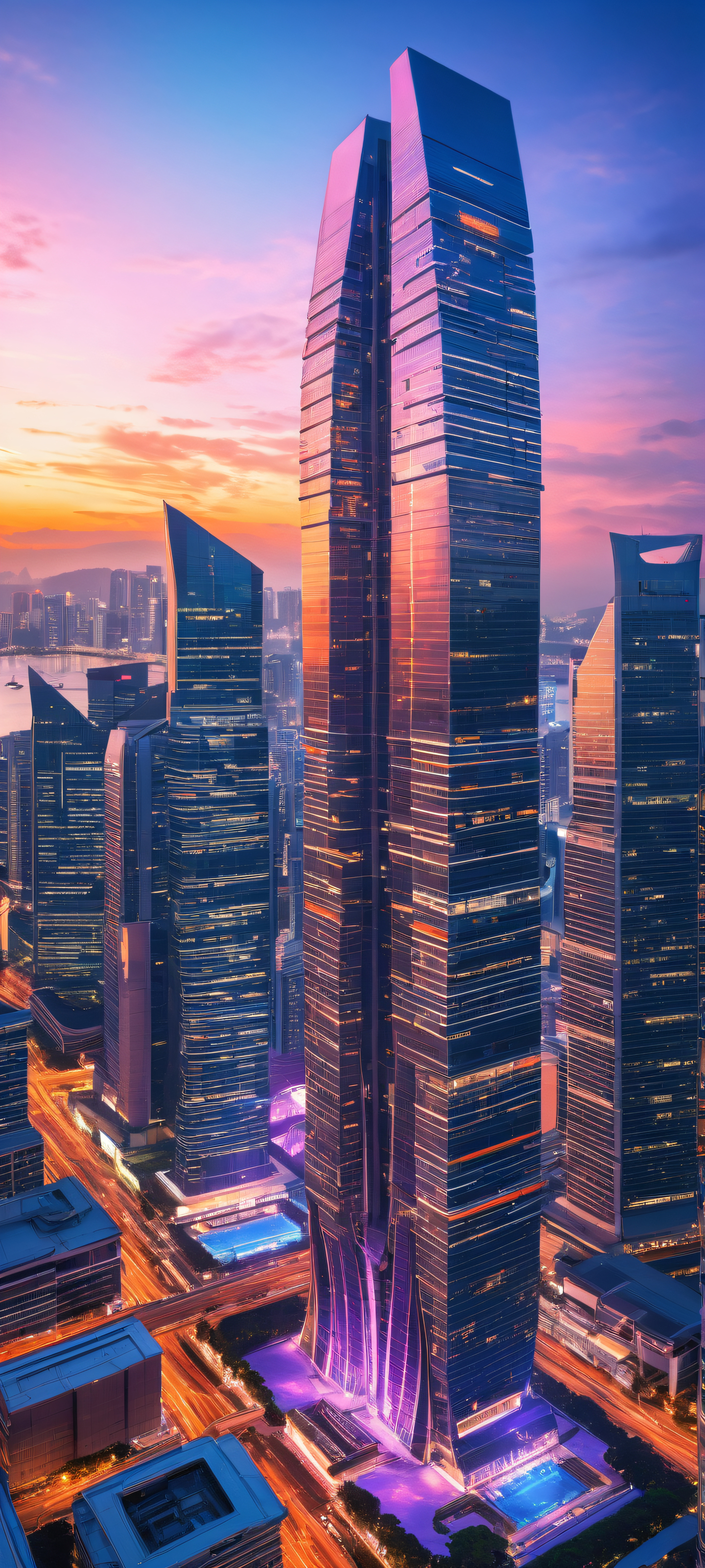 Get lost in the breathtaking vertical portrait artwork of a futuristic Singapore skyscraper, perfectly optimized for your iPhone or Samsung Galaxy home screen. This stunning digital art features intricate micro-details, ethereal lighting, and brilliant colors, creating an otherworldly ambiance that draws you in.
