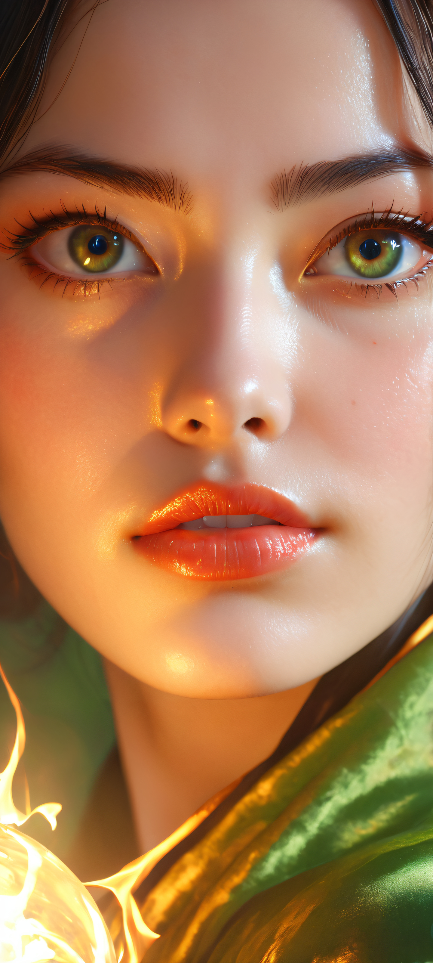iPhone用に完全に最適化, サムスンギャラクシー, と Android のホーム画面, this stunning artwork features a beautifully rendered vertical portrait of Dori in the lower-middle, with a perfectly clean and empty top half that allows for seamless UI breathing space. The dominant green hues with subtle golden undertones evoke a sense of mystique and wonder, while the ethereal lighting, radiant colors, and ray-traced reflections create an otherworldly visual impact.