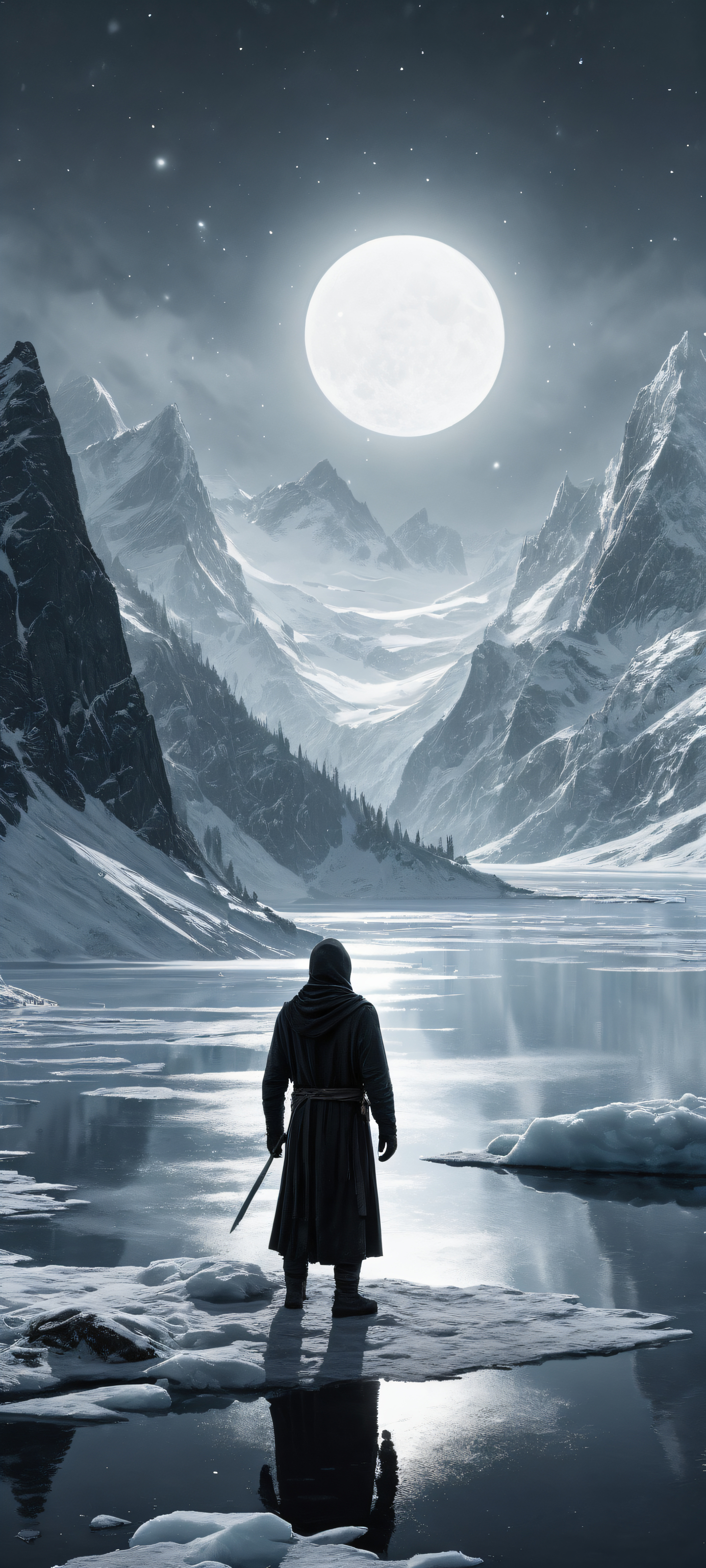 A breathtaking vertical portrait artwork of A lone wanderer placed in the lower-middle, intricate micro-details of a tattered shroud and frozen lake, amidst an ominous black eclipse., Perfectly clean and empty top half with vast pure void of ash-filled dark sky and a massive black eclipse, below which lies a smooth reflective frozen lake of black obsidian., Award-winning digital art, 原始的な透明度, and breathtaking cinematic landscape inspired by dark fantasy., Ethereal lighting with radiant pale-white corona from the intense glowing black eclipse, casting an eerie atmosphere on the frozen lake., Dominant color palette: Dark grayscale and pure whites, evoking a sense of melancholic void., ethereal lighting, radiant, brilliant colors, ray traced reflections, 原始的な透明度, portrait composition, centered subject in the lower middle, perfectly clean and smooth top half for UI, extreme depth of field blurred background, highly textured surfaces, intricate micro-details, physically based rendering, award-winning digital art, epic breathtaking scale, stunning visual impact, perfect composition, macOS wallpaper aesthetic, masterpiece, 2K QHD resolution, 9:20 aspect ratio.