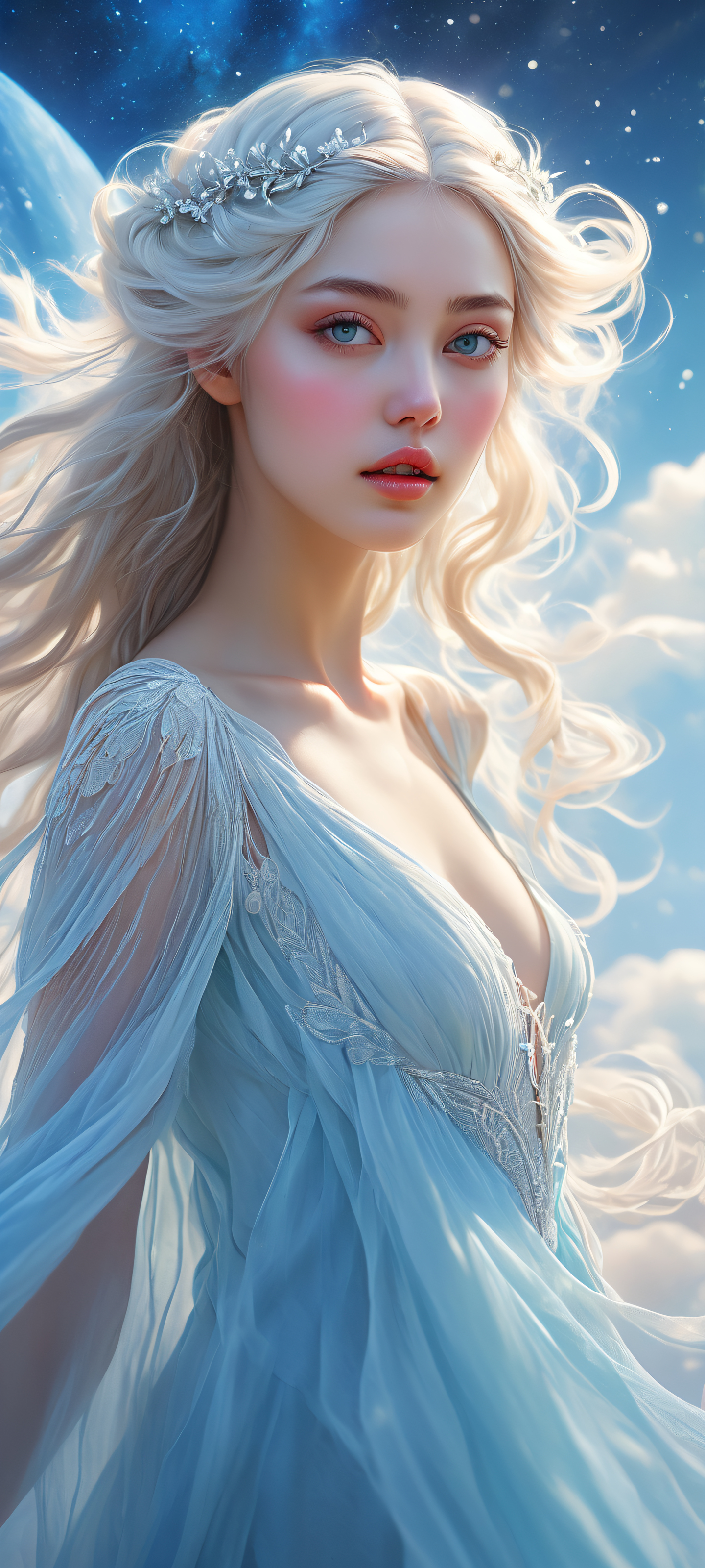 iPhone用に完全に最適化, サムスンギャラクシー, と Android のホーム画面, this breathtaking vertical portrait artwork features Aurora placed in the lower-middle, with intricate swirling clouds and wispy tendrils. The top half is a pristine void, contrasting the subject details below, evoking a sense of weightlessness and freedom.