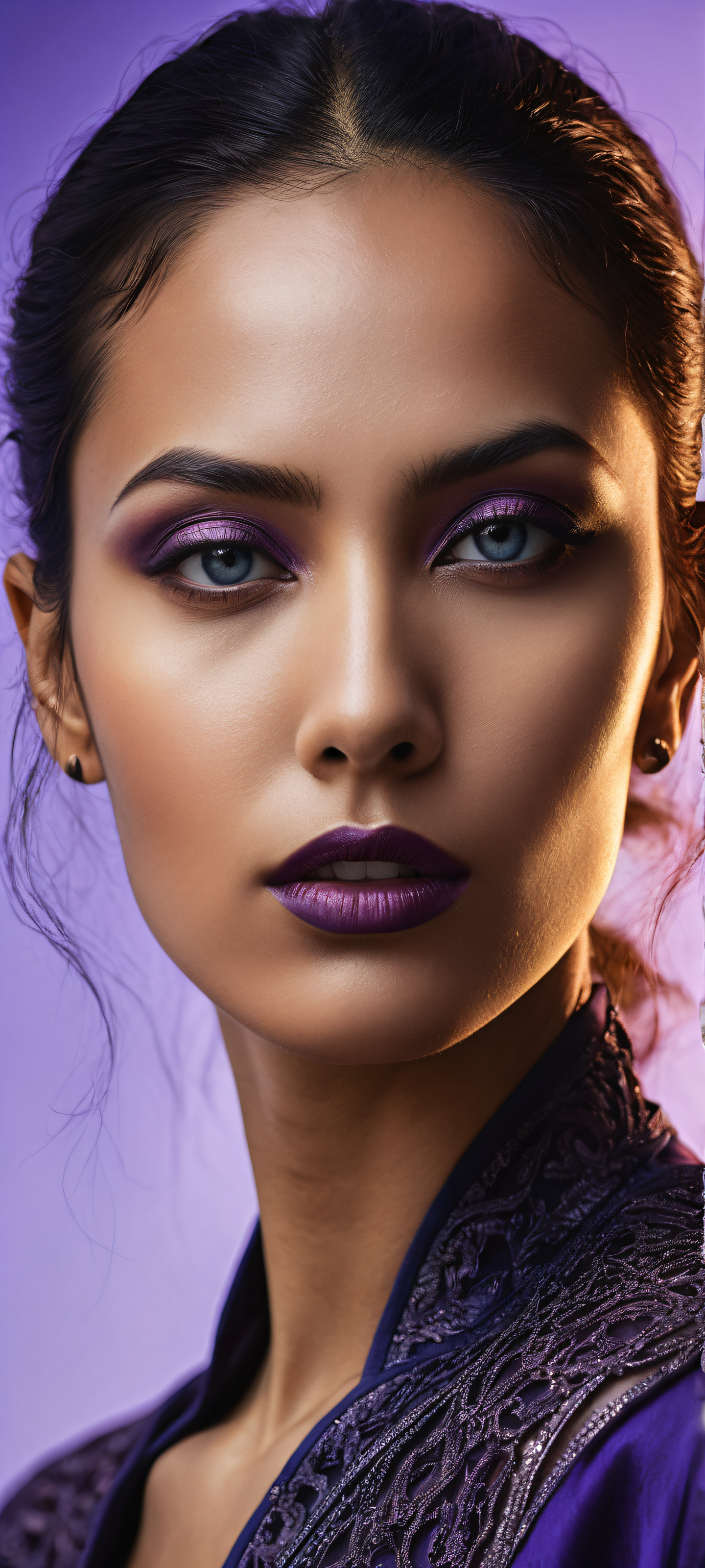 A breathtaking vertical portrait artwork of A hyper-detailed portrait of a woman with skin like polished obsidian, placed in the lower-middle, intricate micro-details, Perfectly clean and empty top half with vast pure void, allowing UI widgets to breathe freely, Award-winning digital art, 原始的な透明度, and stunning visual impact, Soft rim lighting with a touch of ethereal warmth, casting deep shadows that add depth and mystique, #3A3131 (deep blues and purples), accented by #F8E231 (golden hues) そして #333333 (dark shadows), ethereal lighting, radiant, brilliant colors, ray traced reflections, 原始的な透明度, portrait composition, centered subject in the lower middle, perfectly clean and smooth top half for UI, extreme depth of field blurred background, highly textured surfaces, intricate micro-details, physically based rendering, award-winning digital art, epic breathtaking scale, stunning visual impact, perfect composition, macOS wallpaper aesthetic, masterpiece, 2K QHD resolution, 9:20 aspect ratio.