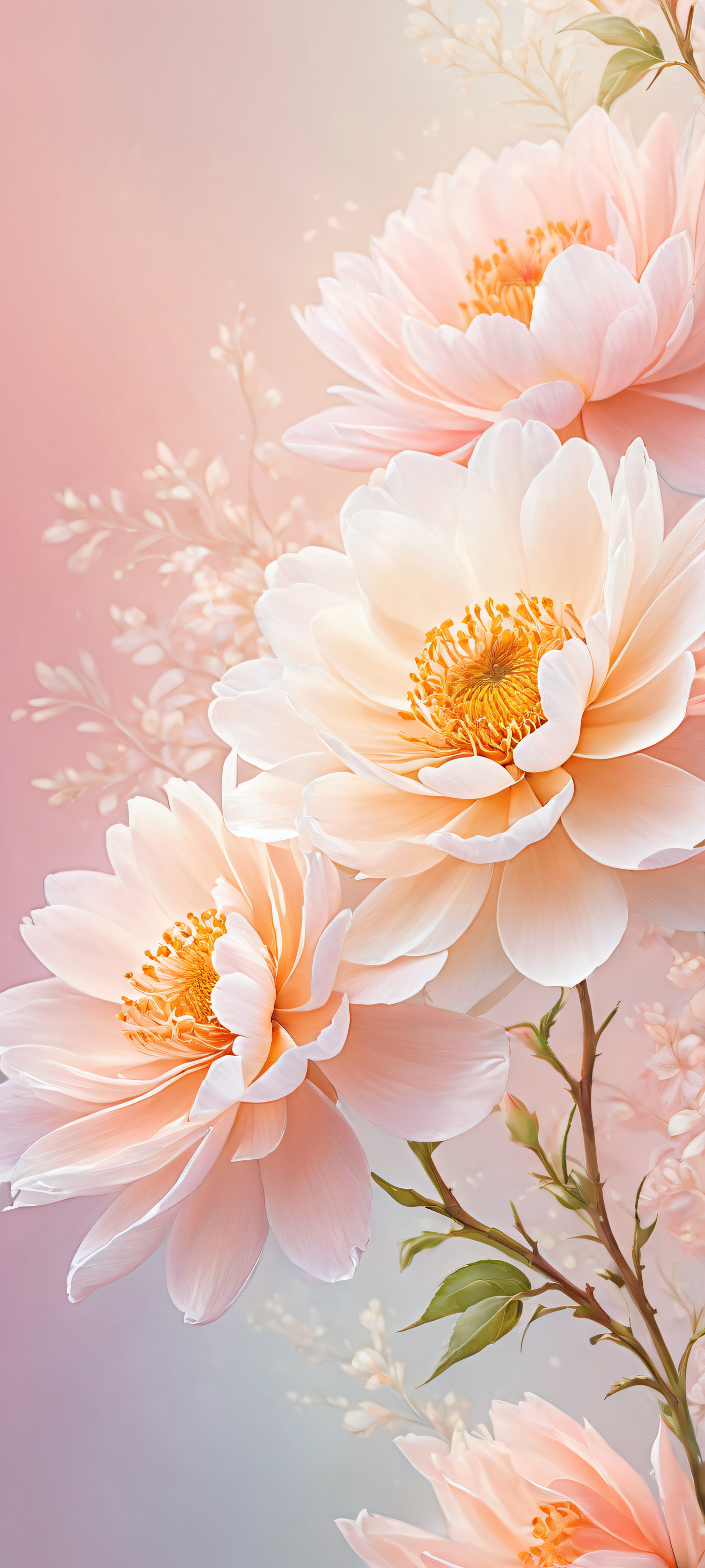 A breathtaking vertical portrait artwork of Delicate Florals placed in the lower-middle with intricate micro-details, Perfectly clean and empty top half with vast pure void of transparent layers and soft edges, Award-winning digital art, pristine clarity and stunning visual impact, Ethereal lighting with radiant, brilliant colors, ray traced reflections and flawless digital mastery, [‘Pastel Pink’, ‘Soft Peach’, ‘Cream’], ethereal lighting, radiant, brilliant colors, ray traced reflections, 原始的な透明度, portrait composition, centered subject in the lower middle, perfectly clean and smooth top half for UI, extreme depth of field blurred background, highly textured surfaces, intricate micro-details, physically based rendering, award-winning digital art, epic breathtaking scale, stunning visual impact, perfect composition, macOS wallpaper aesthetic, masterpiece, 2K QHD resolution, 9:20 aspect ratio.